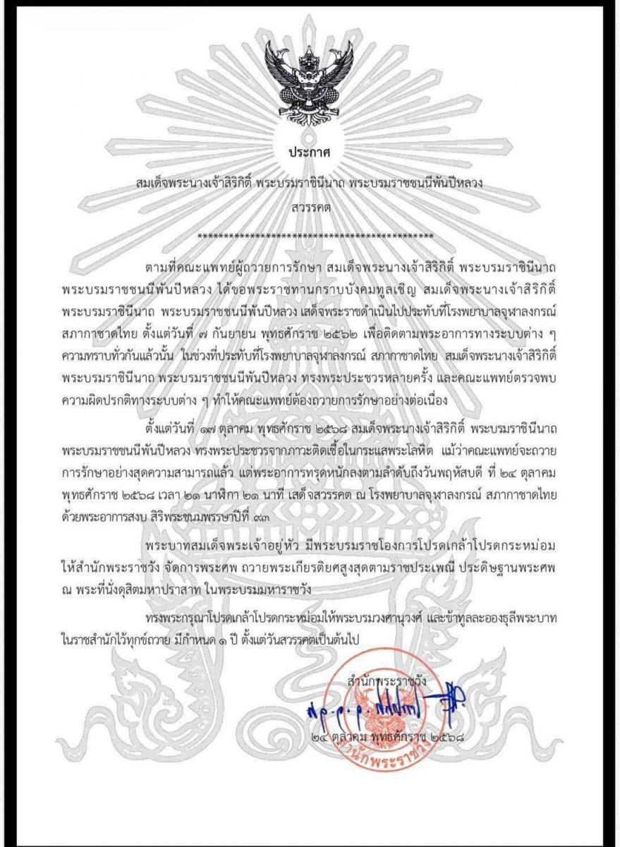 วันที่ 25 ต.ค.2568 สำนักพระราชวัง เผยแพร่ประกาศ สมเด็จพระนางเจ้าสิริกิติ์ พระบรมราชินีนาถ พระบรมราชชนนีพันปีหลวง สวรรคต