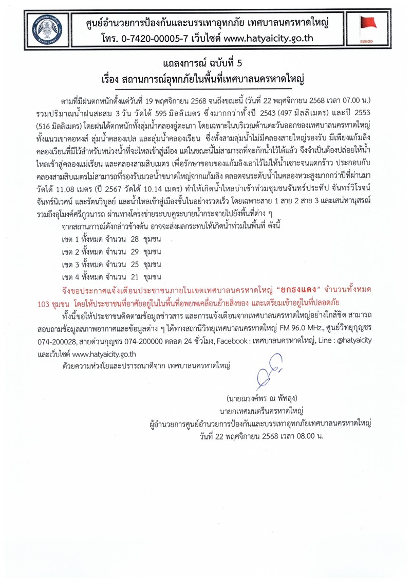 จากสถานการณ์ข้างต้นอาจจะส่งผลกระทบทำให้เกิดน้ำท่วมในพื้นที่เขต 1 ทั้งหมด จำนวน 28 ชุมชน เขต 2 ทั้งหมด จำนวน 29 ชุมชน เขต 3 ทั้งหมดจำนวน 8 ชุมชน จึงขอประกาศแจ้งเตือนประชาชนภายในเขตเทศบาลนครหาดใหญ่ “ยกธงแดง” จำนวนทั้งหมด 65 ชุมชน โดยให้ประชาชนที่อาศัยอยู่ในพื้นที่อพยพเคลื่อนย้ายสิ่งของ และเตรียมเข้าอยู่ในที่ปลอดภัย