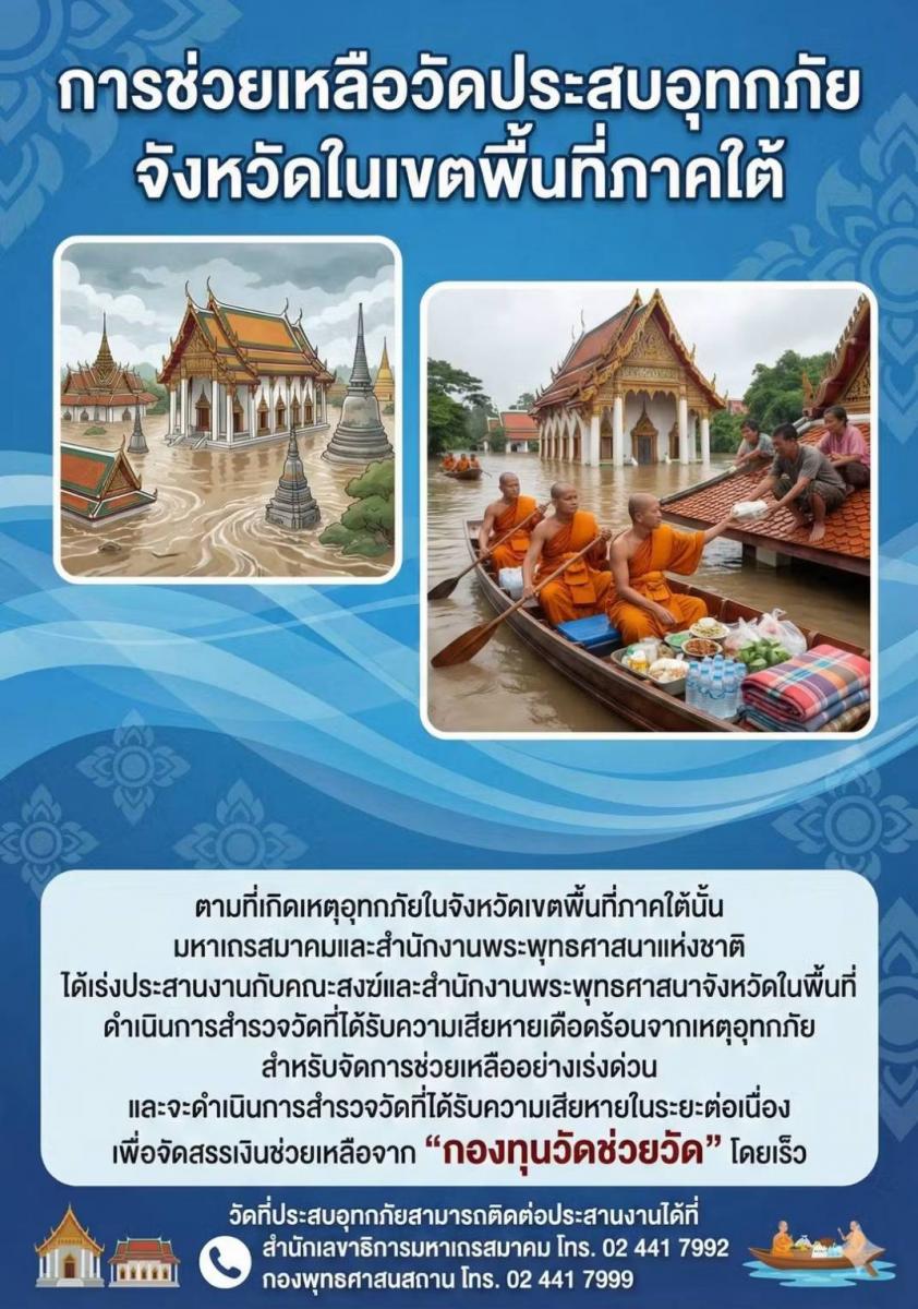 พร้อมทั้งโปรดให้สำนักงานพระพุทธศาสนาแห่งชาติ (พศ.) ประสานภารกิจสำรวจความเดือดร้อนจำเป็นอย่างเร่งด่วน โดยพศ.ได้มอบหมายให้สำนักพระพุทธศาสนาจังหวัดในเขตภาคใต้ สรุปข้อมูลเพื่อดำเนินการสนองพระดำริแล้ว ส่วนวัดในเขตภาคใต้ที่ประสบอุทกภัยและต้องการความช่วยเหลือเร่งด่วน โปรดให้ประสานผอ.สำนักงานพระพุทธศาสนาจังหวัด