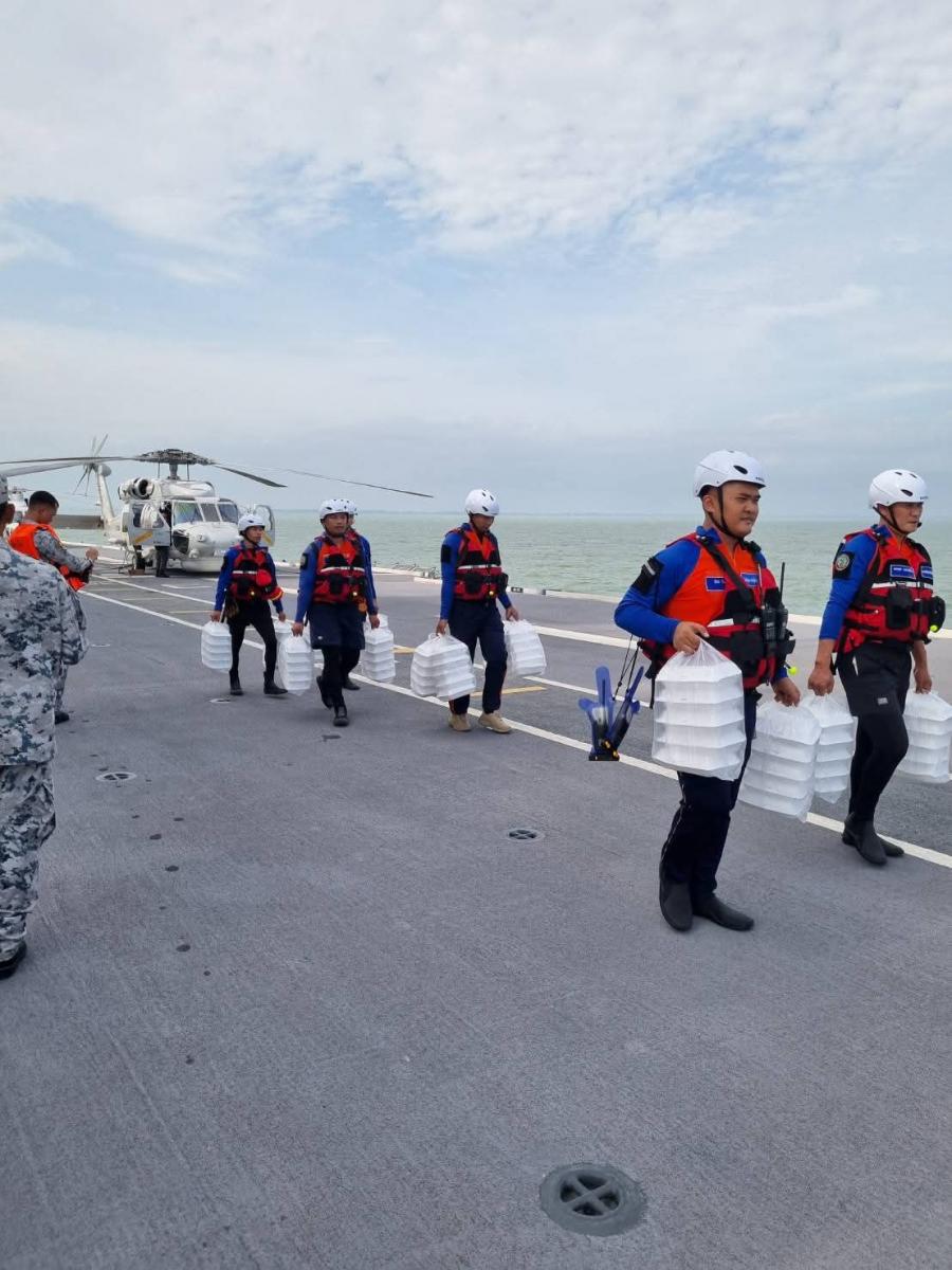 กำลังพลประจำโรงครัวได้จัดเตรียมอาหารปรุงสุกและน้ำดื่ม จำนวน 3,000 ชุด เพื่อส่งมอบให้ประชาชนในพื้นที่ประสบภัยในหลายจุดที่การสัญจรทางบกยังเข้าถึงได้ยาก โดยได้จัดอากาศยานเฮลิคอปเตอร์ของกองทัพเรือทำการลำเลียงสิ่งของบรรเทาทุกข์ดังกล่าวขึ้นบินในช่วงเช้าของวันนี้แล้ว