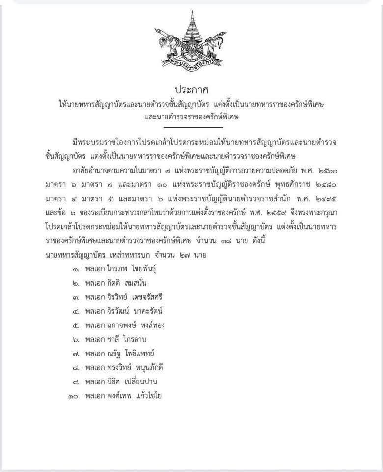จึงทรงพระกรุณาโปรดเกล้าโปรดกระหม่อมให้นายทหารสัญญาบัตรและนายตำรวจชั้นสัญญาบัตร แต่งตั้งเป็นนายทหารราชองครักษ์พิเศษและนายตำรวจ ราชองครักษ์พิเศษ จำนวน 38 นาย