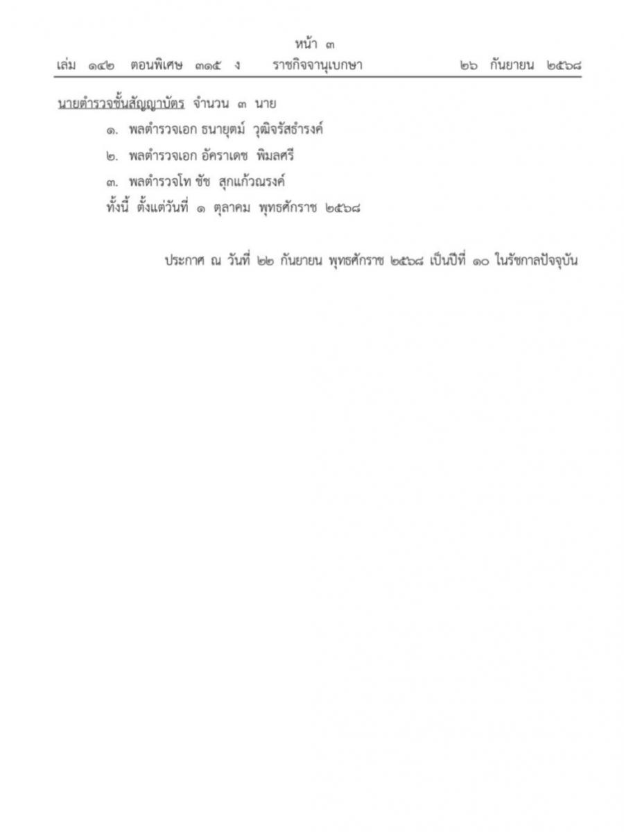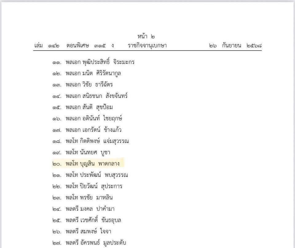 วันที่ 27 ก.ย. 2568 เว็บไซต์ราชกิจจานุเบกษา เผยแพร่ประกาศให้นายทหารสัญญาบัตรและนายตำรวจชั้นสัญญาบัตร แต่งตั้งเป็นนายทหารราชองครักษ์พิเศษและนายตำรวจราชองครักษ์พิเศษ มีพระบรมราชโองการโปรดเกล้าโปรดกระหม่อมให้นายทหารสัญญาบัตรและนายตำรวจชั้นสัญญาบัตร แต่งตั้งเป็นนายทหารราชองครักษ์พิเศษและนายตำรวจราชองครักษ์พิเศษ
