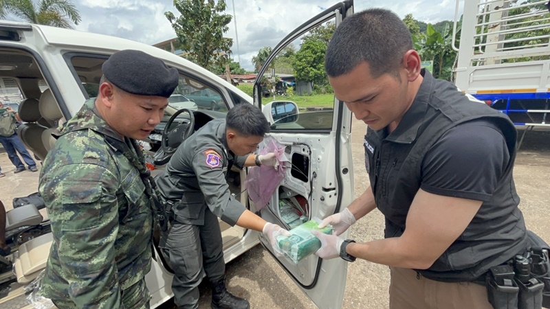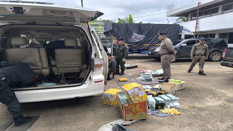 เจ้าหน้าที่ฝ่ายความมั่นคงประจำจุดตรวจร่วมสามแยกทองผาภูมิ พบรถยนต์ ยี่ห้อ Toyota Alphad สีขาว หมายเลขทะเบียน กล 5467 กาญจนบุรี ลักษณะตรงตามที่ได้รับแจ้งจากแหล่งข่าว ขับมาจาก อ.สังขละบุรี มุ่งหน้า อ.เมืองกาญจนบุรี จึงให้สัญญาณหยุดรถเพื่อตรวจสอบ พบ นายชนาธิป แสวงศิลป์ อายุ 51 ปี เป็นผู้ขับขี่ ซึ่งขณะที่เจ้าหน้าที่พูดคุยสอบถาม นายชนาธิปฯ แสดงอาการพิรุธชัดเจน จึงขออนุญาตทำการตรวจค้นภายในรถยนต์คันดังกล่าวอย่างละเอียด ในเวลาต่อมาเจ้าหน้าที่ตรวจพบว่าสภาพรถถูกดัดแปลงเพื่อซุกซ่อนยาเสพติดไว้ภายในจำนวนมาก โดยเจ้าหน้าที่สามารถตรวจยึดของกลางได้ดังนี้