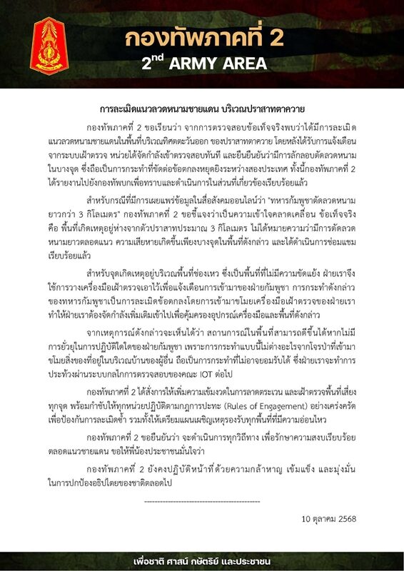 กองทัพภาคที่ 2 ขอยืนยันว่า จะดำเนินการทุกวิถีทาง เพื่อรักษาความสงบเรียบร้อยตลอดแนวชายแดน ขอให้พี่น้องประชาชนมั่นใจว่ากองทัพภาคที่ 2 ยังคงปฏิบัติหน้าที่ด้วยความกล้าหาญ เข้มแข็ง และมุ่งมั่นในการปกป้องอธิปไตยของชาติตลอดไป