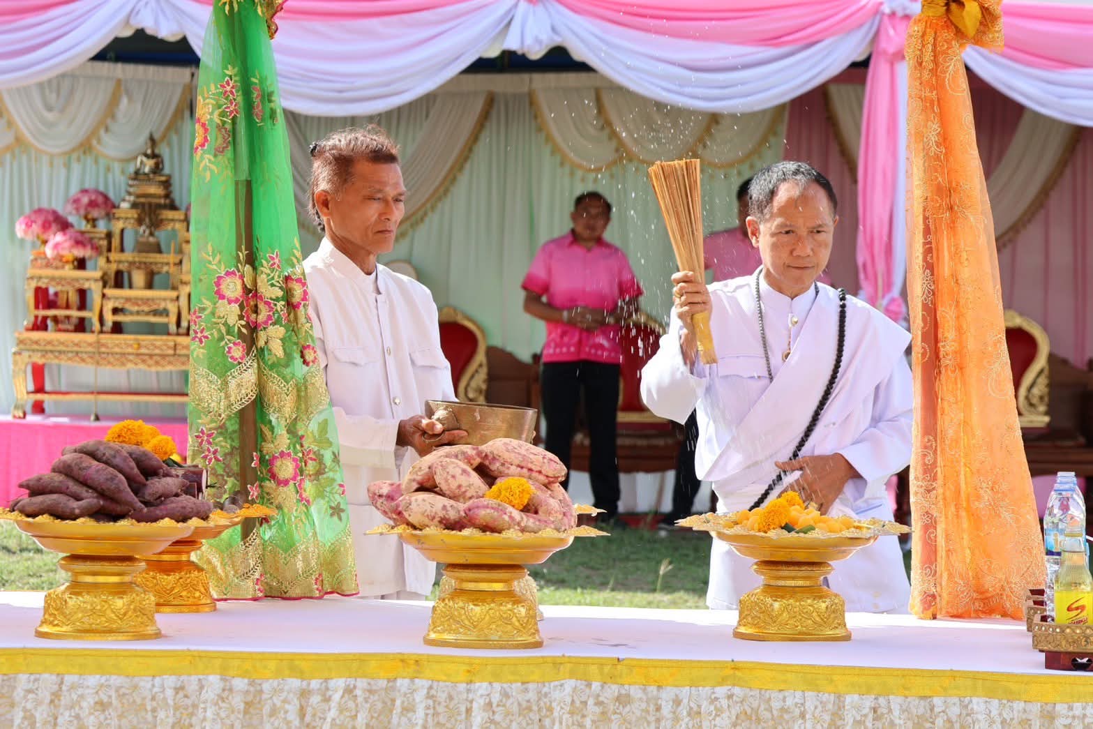 พิธีการเริ่มต้นด้วย นายอำเภอวังม่วง ถวายผ้าแพรเจ็ดสี และเริ่มพิธีบวงสรวงฯ จากนั้นเวลา 10.10 น. พระครูวรเขตภิบาล เจ้าคณะอำเภอวังม่วง ประธานฝ่ายสงฆ์ พร้อมด้วยพระสังฆาธิการรวม 10 รูป ได้ประกอบพิธีเจริญพระพุทธมนต์