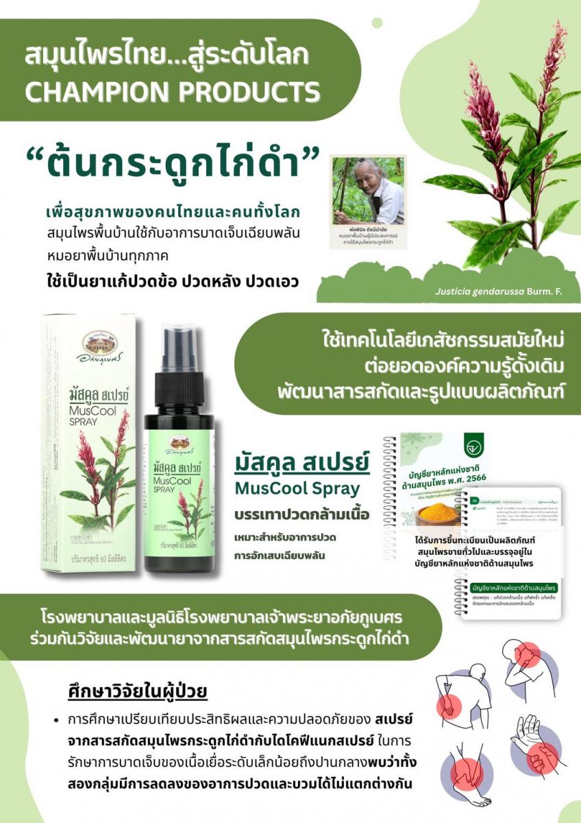 “มัสคูลสเปรย์ เป็นยาสมุนไพรในบัญชียาหลักแห่งชาติที่สามารถเบิกจ่ายได้ทุกสิทธิการรักษา โดยภายในบูธได้จัดแสดงเส้นทางการพัฒนาผลิตภัณฑ์ ตั้งแต่ต้นสมุนไพร “กระดูกไก่ดำ (Justicia gendarussa)” ทั้งในรูปต้นจริงและต้นแห้ง กระบวนการสกัดสารสำคัญ การพัฒนาเป็นผลิตภัณฑ์รูปแบบสเปรย์ และการควบคุมคุณภาพตามมาตรฐาน GMP PIC/S”