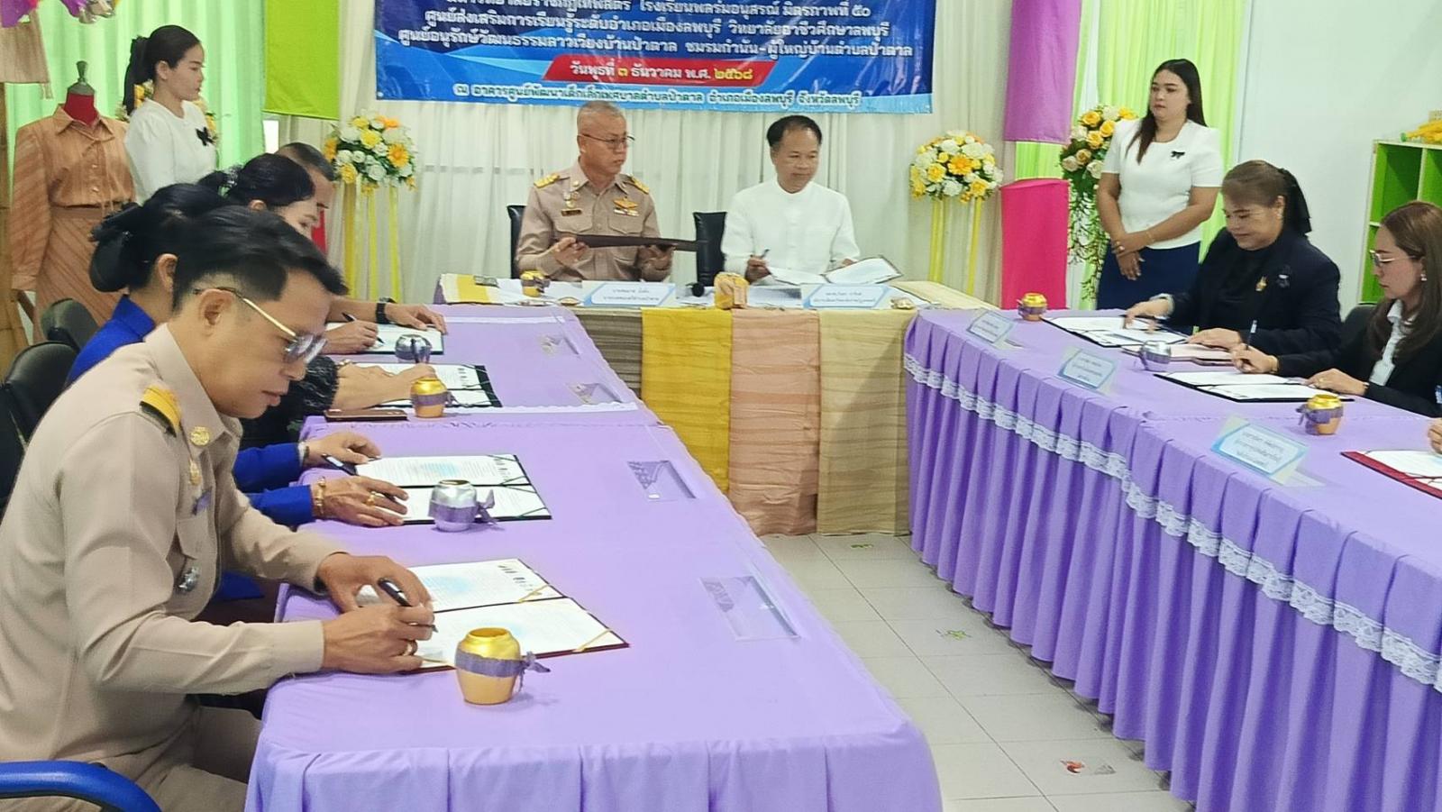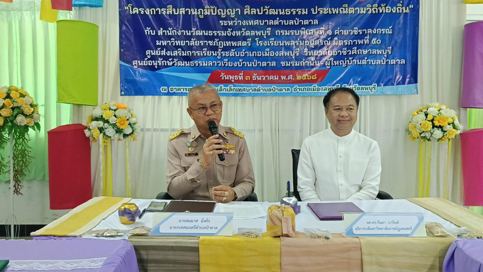 เทศบาลตำบลป่าตาลจัดพิธีลงนามบันทึกข้อตกลงความร่วมมือ (MOU) โครงการสืบสานภูมิปัญญา ศิลปวัฒนธรรม และประเพณีท้องถิ่น ประจำปีงบประมาณ 2569 เมื่อวันที่ 3 ธันวาคม 2568 เวลา 10.00 น. ณ ห้องประชุมศูนย์พัฒนาเด็กเล็กเทศบาลตำบลป่าตาล อำเภอเมืองลพบุรี โดยมีนายสมมาส มั่งคั่ง นายกเทศมนตรีตำบลป่าตาล เป็นประธานในพิธี