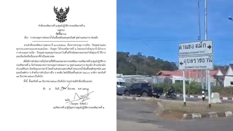 วันที่ 15 ธ.ค.2568 พลโท วีระยุทธ รักศิลป์ แม่ทัพภาคที่ 2 ได้ลงนามในหนังสือการควบคุมการส่งออกน้ำมันเชื้อเพลิง และยุทธภัณฑ์ จุดผ่านแดนถาวรช่องเม็ก เริ่มตั้งแต่เวลา 24.00 น. วันนี้ เป็นต้นไป