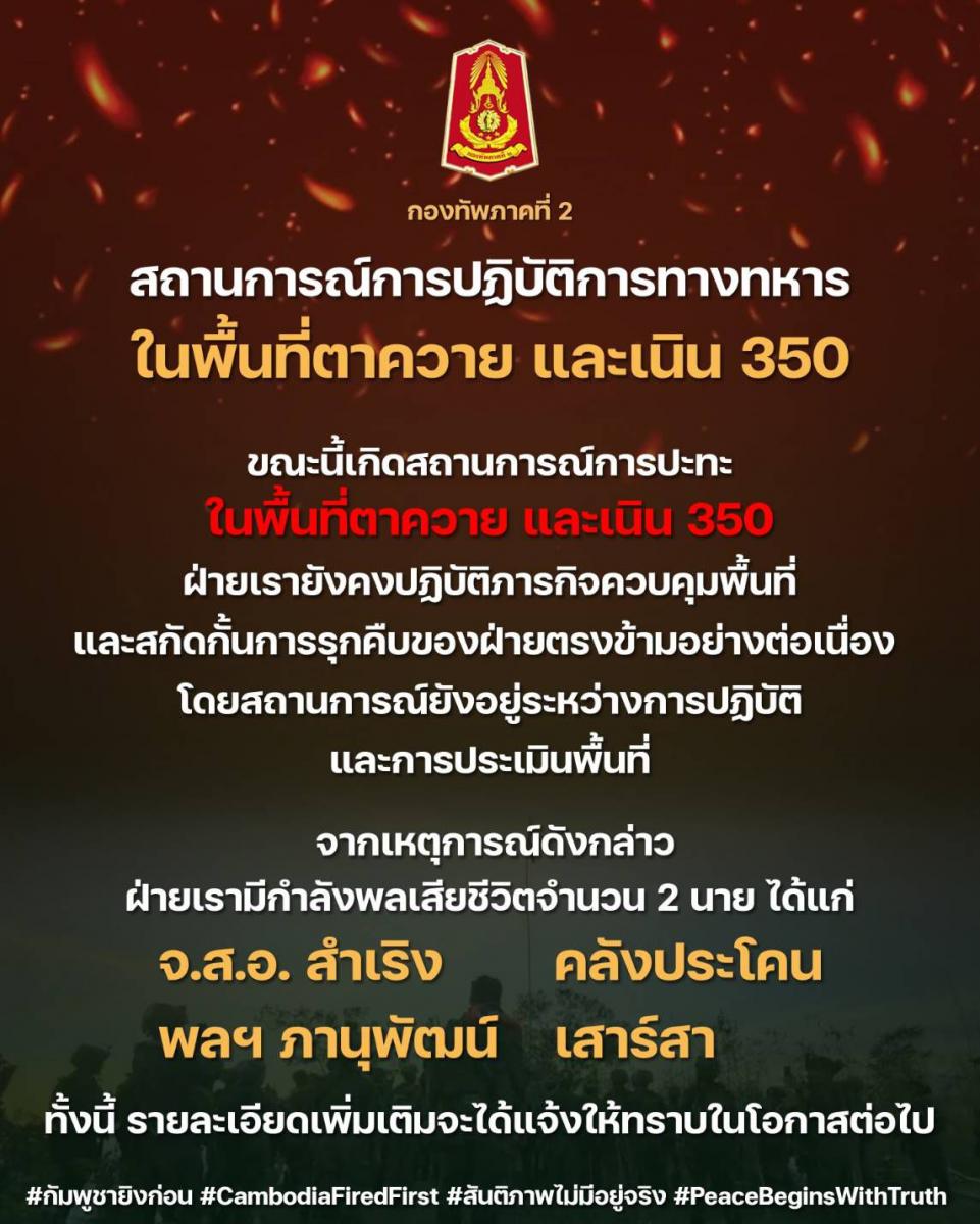 กองทัพภาคที่ 2 ขอแสดงความเสียใจอย่างสุดซึ้งต่อการสูญเสียกำลังพลจากการปฏิบัติหน้าที่อีก 2 นาย ได้แก่ จ.ส.อ.สำเริง คลังประโคน และ พลทหาร ภานุพัฒน์ เสาร์สา ซึ่งได้ปฏิบัติหน้าที่ด้วยความเสียสละและความกล้าหาญ