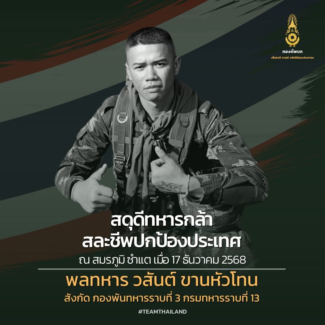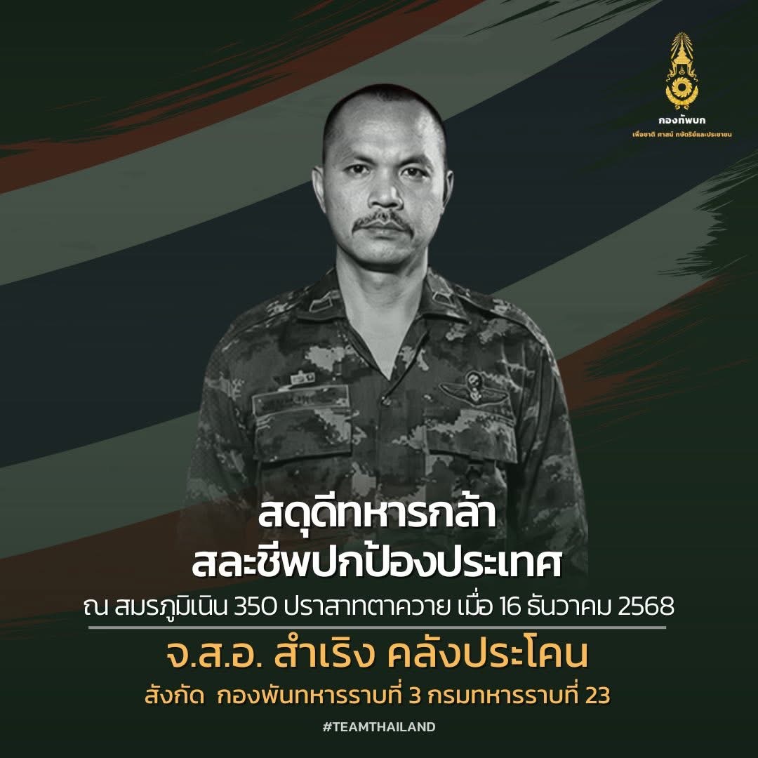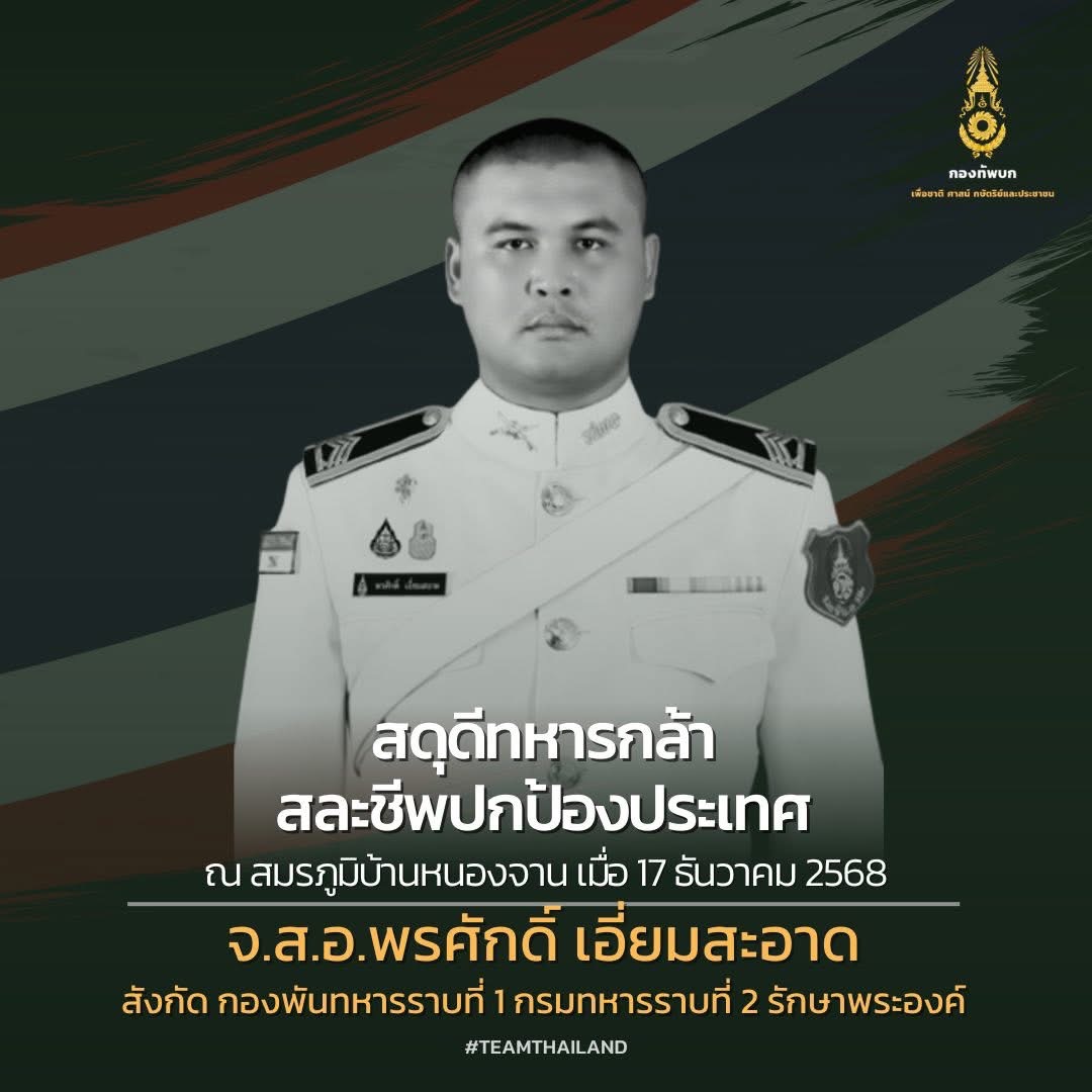 - จ.ส.อ.พรศักดิ์ เอี่ยมสะอาด สังกัด กองพันทหารราบที่ 1 กรมทหารราบที่ 2 รักษาพระองค์ เสียชีวิตในสมรภูมิ บ้านหนองจาน เมื่อวันที่ 17 ธันวาคม 2568