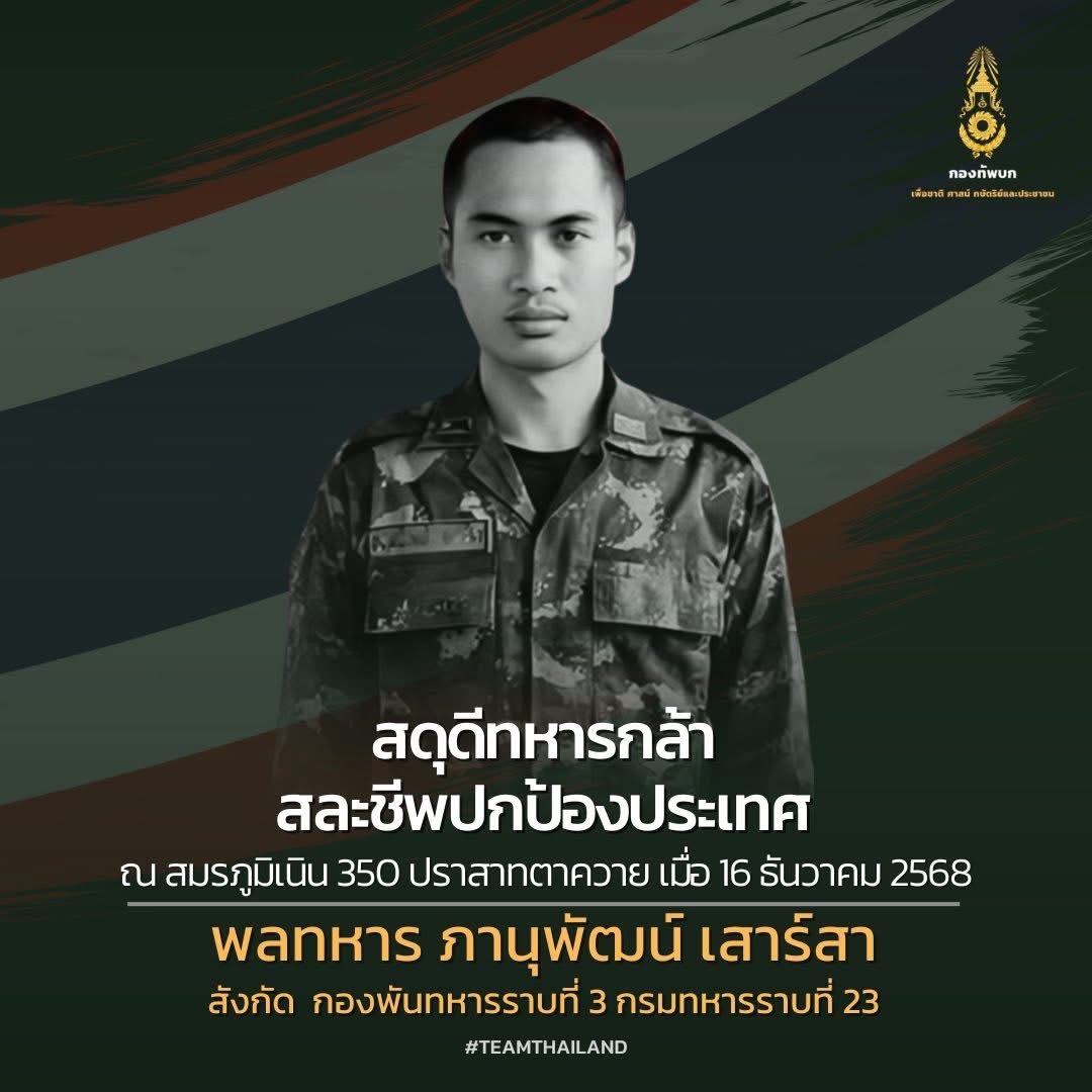 -พลทหาร ภานุพัฒน์ เสาร์สา สังกัด กองพันทหารราบที่ 3 กรมทหารราบที่ 23 เสียชีวิตในสมรภูมิเนิน 350 ปราสาทตาควาย