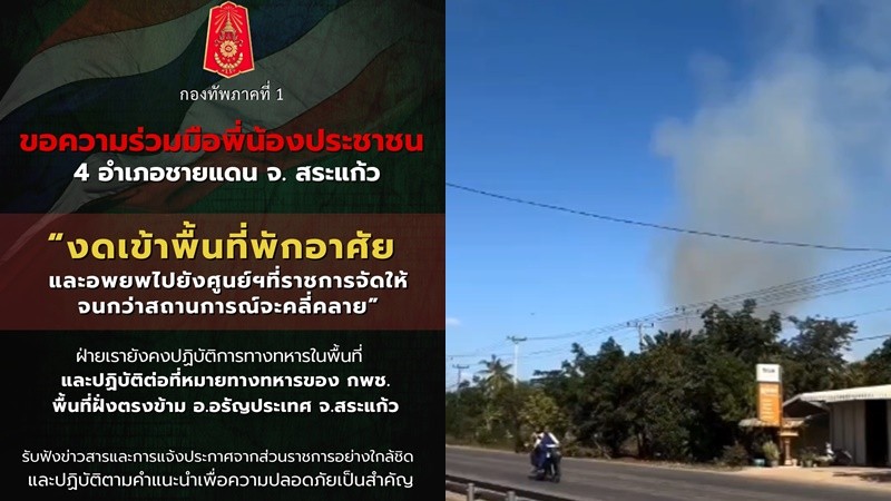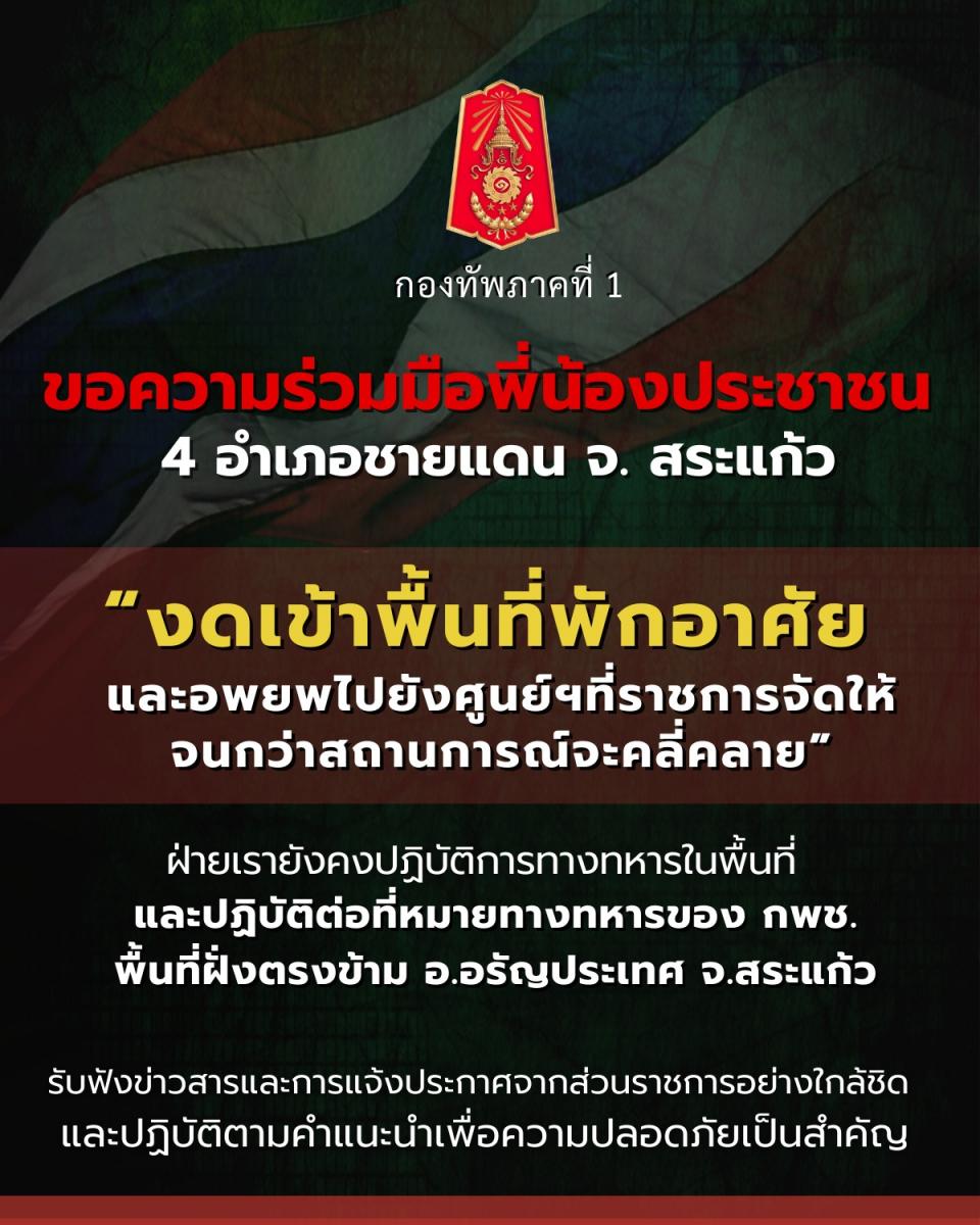 ศูนย์ปฏิบัติการกองทัพภาคที่ 1 จึงขอความร่วมมือพี่น้องประชาชน 4 อำเภอชายแดน จ. สระแก้ว