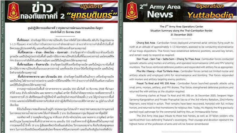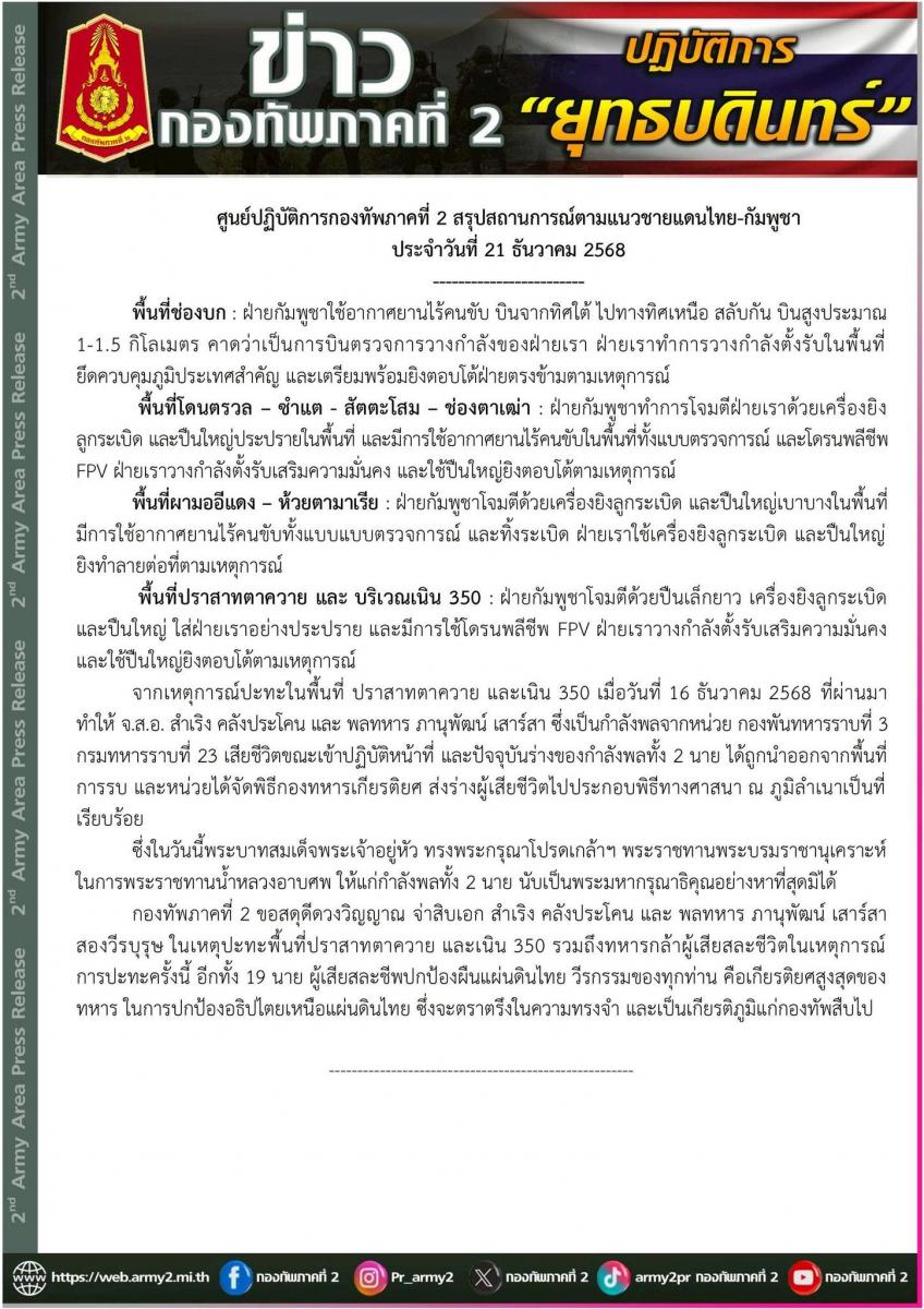 วันที่ 22 ธ.ค.2568 ศูนย์ปฏิบัติการกองทัพภาคที่ 2 สรุปสถานการณ์ตามแนวชายแดนไทย-กัมพูชา ( 21 ธ.ค.) ดังนี้