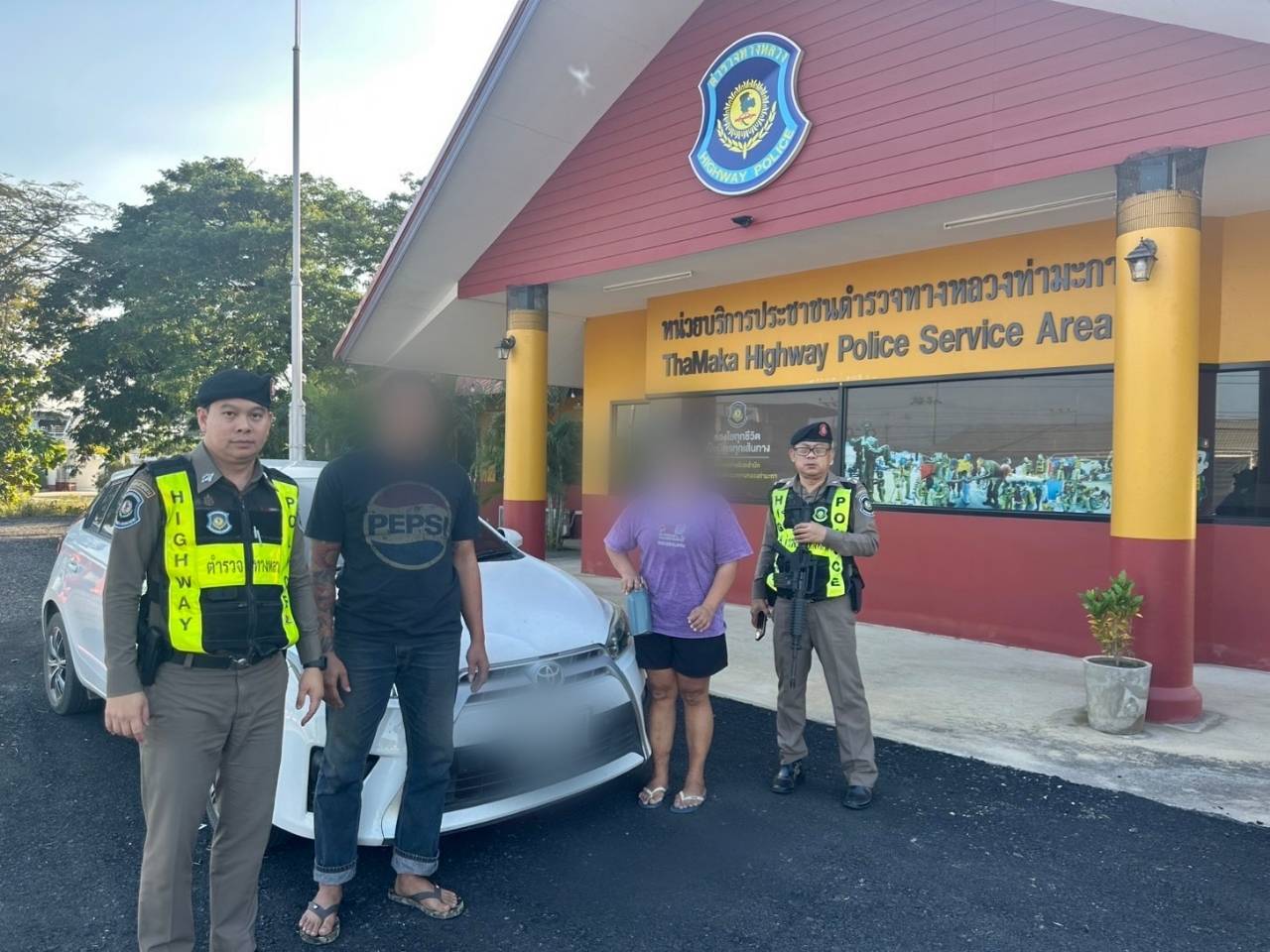 ต่อมาเมื่อรถยนต์คันดังกล่าวขับมาถึง ถนนทางหลวงหมายเลข 323 กม.29 ตำบลท่ามะกา อำเภอท่ามะกา จังหวัดกาญจนบุรี เจ้าหน้าที่ตำรวจทางหลวงได้ส่งสัญญาณให้หยุดรถเพื่อตรวจสอบ พบว่า ผู้ขับขี่คือ นายสหรัฐฯ (สงวนนามสกุล) ผู้ต้องหาที่ 2 จึงได้ควบคุมตัวพร้อมรถยนต์คันดังกล่าวไปยังหน่วยบริการตำรวจทางหลวงท่ามะกา เพื่อตรวจสอบโดยละเอียด