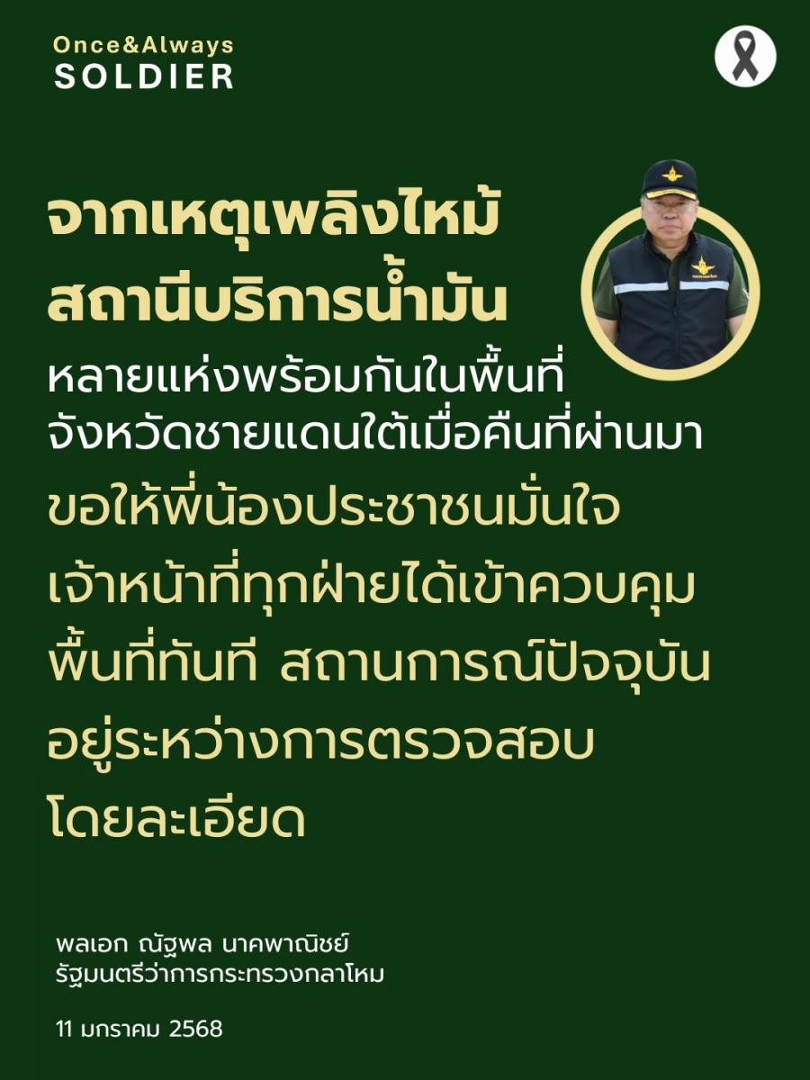 วันที่ 11 ม.ค.2569 จากเหตุคนร้ายลอบวางเพลิงและระเบิดปั๊มน้ำมัน ปตท. หลายจุดในพื้นที่ 3 จังหวัดชายแดนภาคใต้ เมื่อกลางดึกวานนี้ ขณะนี้เจ้าหน้าที่ฝ่ายความมั่นคงได้ทำการปิดกั้นพื้นที่เพื่อความปลอดภัยและเข้าตรวจสอบที่เกิดเหตุอย่างละเอียดเพื่อหาสาเหตุและรวบรวมพยานหลักฐาน