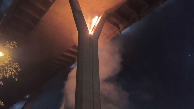 ที่เกิดเหตุพบเพลิงลุกไหม้จากบริเวณฐานตอม่อสะพาน ก่อนจะลุกลามขึ้นไปติดท่อยางพีอี (PE) สำหรับระบายน้ำของโครงสร้างสะพาน ทำให้เกิดเปลวไฟลุกไหม้เป็นแนวยาวในระดับเดียวกับเสาตอม่อ สร้างความแตกตื่นให้กับประชาชนและผู้ใช้เส้นทางเป็นอย่างมาก เจ้าหน้าที่ดับเพลิงพยายามฉีดน้ำจากด้านล่าง แต่ไม่สามารถส่งน้ำขึ้นไปถึงจุดเพลิงไหม้บริเวณใต้คานสะพาน ซึ่งมีความสูงจากพื้นดินกว่า 50 เมตร จึงต้องประสานรถดับเพลิงชนิดกระเช้าเข้าช่วยเหลือ พร้อมกันนี้เจ้าหน้าที่ได้ปิดการจราจรบนสะพาน 1 ช่องทาง เพื่อให้สามารถฉีดน้ำจากด้านบนลงไปยังจุดเกิดเหตุได้ ต่อมารถดับเพลิงแบบกระเช้าเดินทางมาถึง เจ้าหน้าที่ได้กางขากระเช้าและยกกระเช้าพานักดับเพลิงขึ้นฉีดน้ำควบคุมเพลิงอย่างต่อเนื่อง ใช้เวลากว่า 1 ชั่วโมง เพลิงจึงสงบ