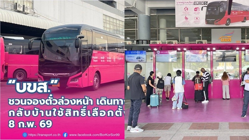 วันที่ 20 ม.ค.2569 นายอรรถวิท รักจำรูญ กรรมการผู้จัดการใหญ่ บริษัท ขนส่ง จำกัด (บขส.) เปิดเผยว่า ได้เตรียมความพร้อมอำนวยความสะดวกประชาชนเดินทางกลับไปใช้สิทธิ์เลือกตั้งสมาชิกสภาผู้แทนราษฎร ในวันอาทิตย์ที่ 8 กุมภาพันธ์ 2569 บขส. คาดการณ์ว่าผู้โดยสารจะทยอยเดินทางออกจากกรุงเทพฯ ไปยังจังหวัดต่าง ๆ ทั่วทุกภูมิภาค ตั้งแต่วันที่ 6 – 7 กุมภาพันธ์ 2569 ซึ่งผู้โดยสารใช้บริการในเที่ยวไป – กลับ เฉลี่ยวันละ 130,000 คน ใช้รถโดยสาร (รถ บขส. และรถร่วมฯ) เฉลี่ยวันละ 7,000 เที่ยว และในเที่ยวกลับ วันที่ 8 – 9 กุมภาพันธ์ 2569 คาดว่ามีผู้โดยสารเดินทางในเที่ยวไป – กลับ เฉลี่ยวันละ 100,000 คน ใช้รถโดยสารประมาณวันละ 6,000 เที่ยว