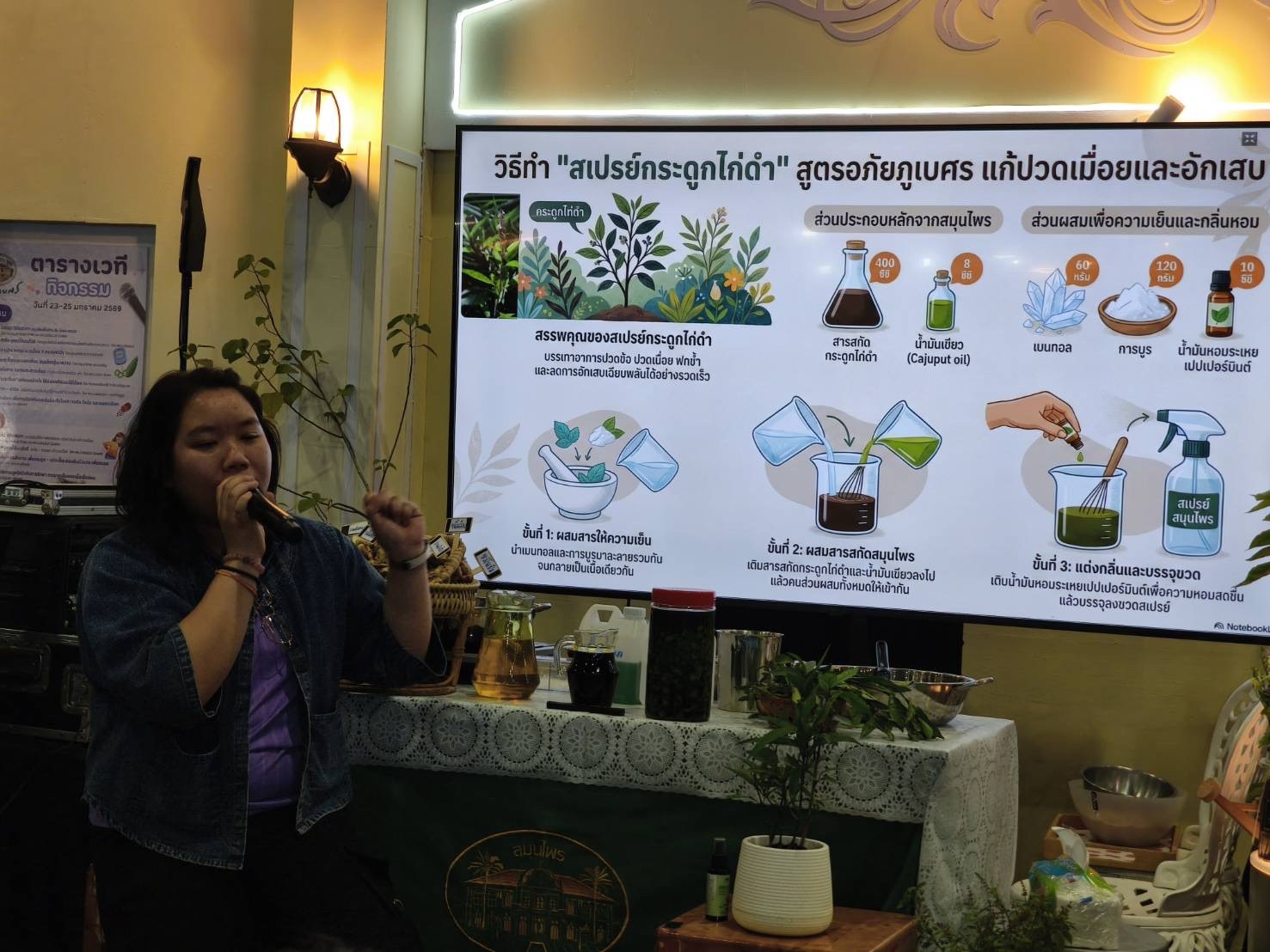 อาการที่พบบ่อย” ว่าเมื่อใดควรเลือกใช้สมุนไพรอย่างเหมาะสม พร้อมถ่ายทอดองค์ความรู้ดั้งเดิมเกี่ยวกับ ตำรับยาต้ม/ดองสมุนไพรแก้ปวดเมื่อย รวมถึงกิจกรรมสาธิตการทำ “สเปรย์กระดูกไก่ดำ” เพื่อบรรเทาอาการปวดด้วยตนเอง ซึ่งผลิตภัณฑ์นี้ได้รับความนิยมมาก ซึ่งผ่านการวิจัยและพัฒนาโดยอภัยภูเบศรมายาวนาน และมีประสบการณ์การใช้จริงในผู้ป่วยจำนวนมากที่ให้ผลลัพธ์ที่น่าพึงพอใจ
