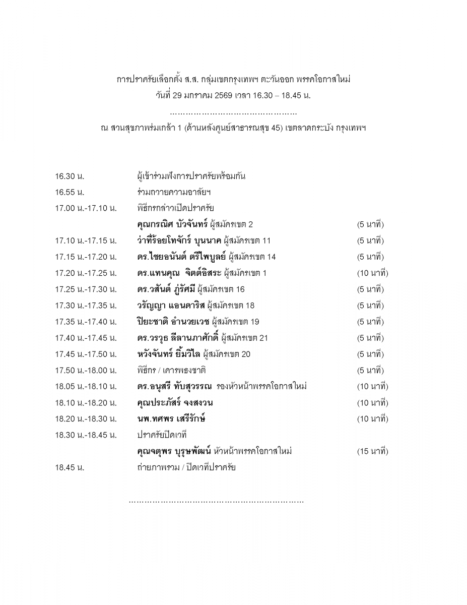 เมื่อวันที่ 29 มกราคม 2569 พรรคโอกาสใหม่จัดเวทีปราศรัยเลือกตั้งสมาชิกสภาผู้แทนราษฎร (ส.ส.) กลุ่มเขตกรุงเทพมหานครฝั่งตะวันออก ณ สวนสุขภาพร่มเกล้า 2 ด้านหลังศูนย์ราชการสุขู 45 เขตลาดกระบัง กรุงเทพมหานคร โดยกิจกรรมจัดขึ้นระหว่างเวลา 16.30–18.45 น. มีประชาชนและผู้สนใจเข้าร่วมรับฟังอย่างคึกคัก