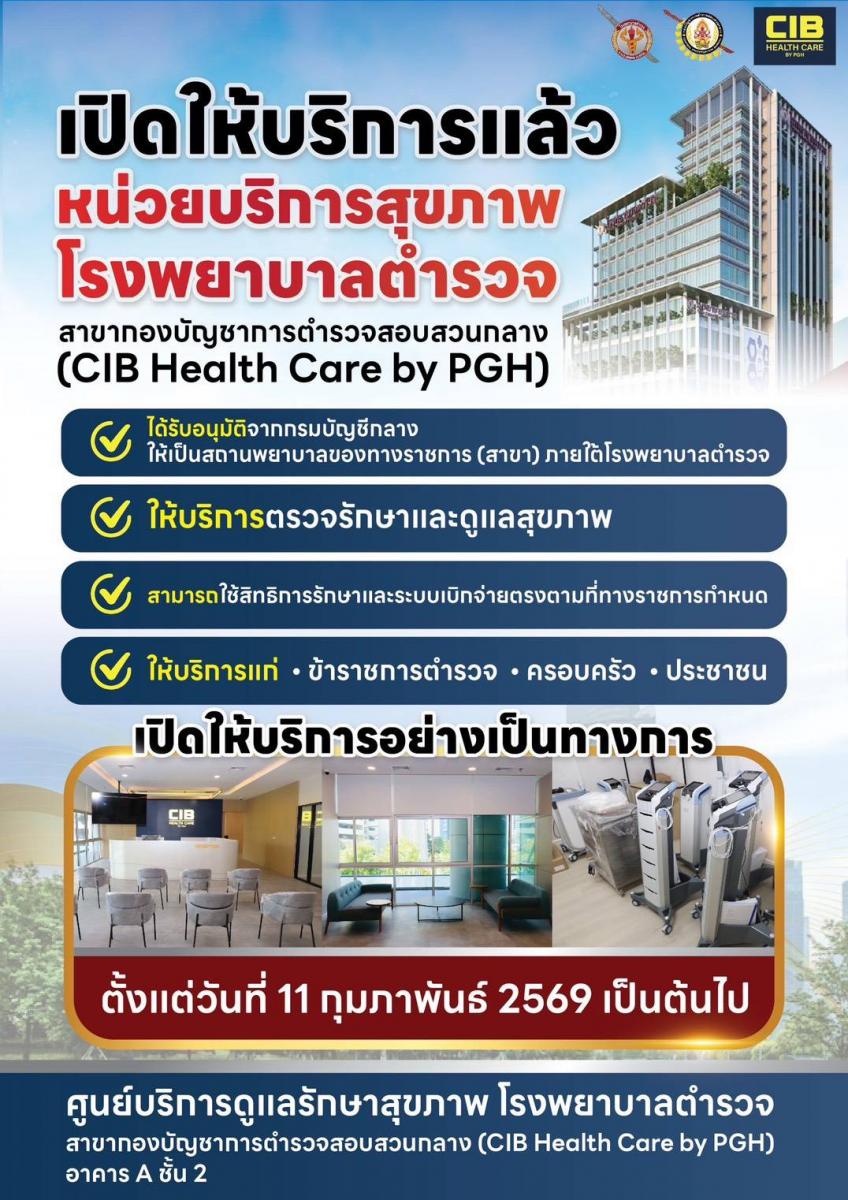 วันที่ 31 มกราคม 2569 พล.ต.ท.ไพบูลย์ เจียมอนุกูลกิจ รักษาราชการแทนนายแพทย์ใหญ่ (สบ 8) โรงพยาบาลตำรวจ เปิดเผยว่าจากนโยบายและข้อสั่งการของ พล.ต.อ.กิตติ์รัฐ พันธุ์เพ็ชร์ ผบ.ตร.และ พล.ต.อ.กรไชย คล้ายคลึง รอง ผบ.ตร.(บร.)ให้โรงพยาบาลตำรวจเปิดให้บริการ ศูนย์บริการดูแลรักษาสุขภาพ โรงพยาบาลตำรวจ สาขากองบัญชาการตำรวจสอบสวนกลาง (CIB Health Care by PGH) อย่างเป็นทางการแล้ว เพื่อรองรับการดูแลสุขภาพของข้าราชการตำรวจ ครอบครัว และประชาชนทั่วไป  สำหรับศูนย์บริการดังกล่าว เปิดให้บริการอย่างเป็นทางการตั้งแต่วันที่ 11 กุมภาพันธ์ 2569 เป็นต้นไป ณ อาคาร A ชั้น 2 กองบัญชาการตำรวจสอบสวนกลาง