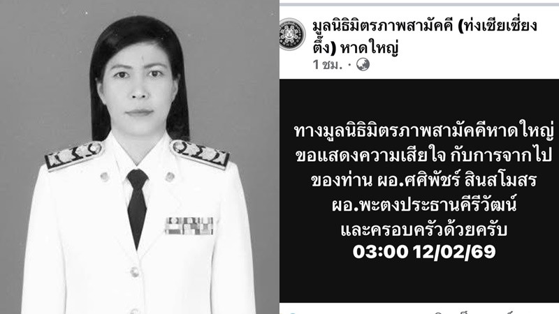 ล่าสุดผู้สื่อข่าวรายงาว่า เพจเฟซบุ๊ก “มูลนิธิมิตรภาพสามัคคี (ท่งเซียเซี่ยงตึ๊ง) หาดใหญ่” โพสต์ข้อความแสดงความอาลัยระบุว่า “ทางมูลนิธิมิตรภาพสามัคคีหาดใหญ่ ขอแสดงความเสียใจ กับการจากไปของท่าน ผอ.ศศิพัชร สินสโมสร ผอ.พะตงประธานคีรีวัฒน์ และครอบครัวด้วยครับ 03:00 12/02/69”