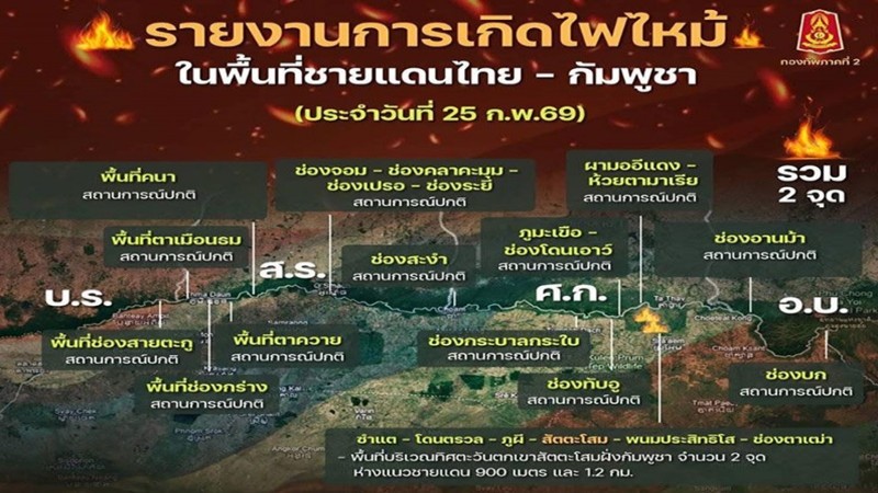 วันที่ 26 ก.พ. 2569 กองทัพภาคที่2 ได้สรุปสถานการณ์เหตุเพลิงไหม้บริเวณแนวชายแดนไทย–กัมพูชา ประจำวันพบจุดความร้อนจำนวน 2 จุด บริเวณฝั่งประเทศกัมพูชา ขณะที่พื้นที่ฝั่งไทยส่วนใหญ่สถานการณ์ปกติ และยังอยู่ในการควบคุมของเจ้าหน้าที่