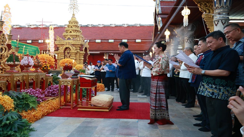 นายกรัฐมนตรี ภริยา และคณะ เดินทางมาถึงวัดพระธาตุช่อแฮ โดยรถ Toyota Alphard 3 ขล 2499 กรุงเทพมหานคร โดยสวมเสื้อม่อฮ่อม พื้นเมือง โดยมีประชาชนสวมชุดพื้นเมือง“ผ้าม่อฮ่อม” และม่อฮ่อม ร่วมสมัย ที่ผสมผสานกับผ้าทอ ผ้าปัก มีความทันสมัย สวยงาม และคงเอกลักษณ์ของท้องถิ่น และมีนางสาวชนกนันท์ ศุภศิริ สส.แพร่ เขต 1 พรรคภูมิใจไทย นายชนาธิป ศุภศิริ สส.แพร่ เขต 2 พรรคภูมิใจ รวมถึงนางศิริวรรณ ปราศจากศัตรู หรือ “แม่เลี้ยงติ๊ก” ผู้สมัคร ส.ส. แบบบัญชีรายชื่อของพรรคภูมิใจไทย และอดีตสส.จังหวัดแพร่หลายสมัย รอต้อนรับ