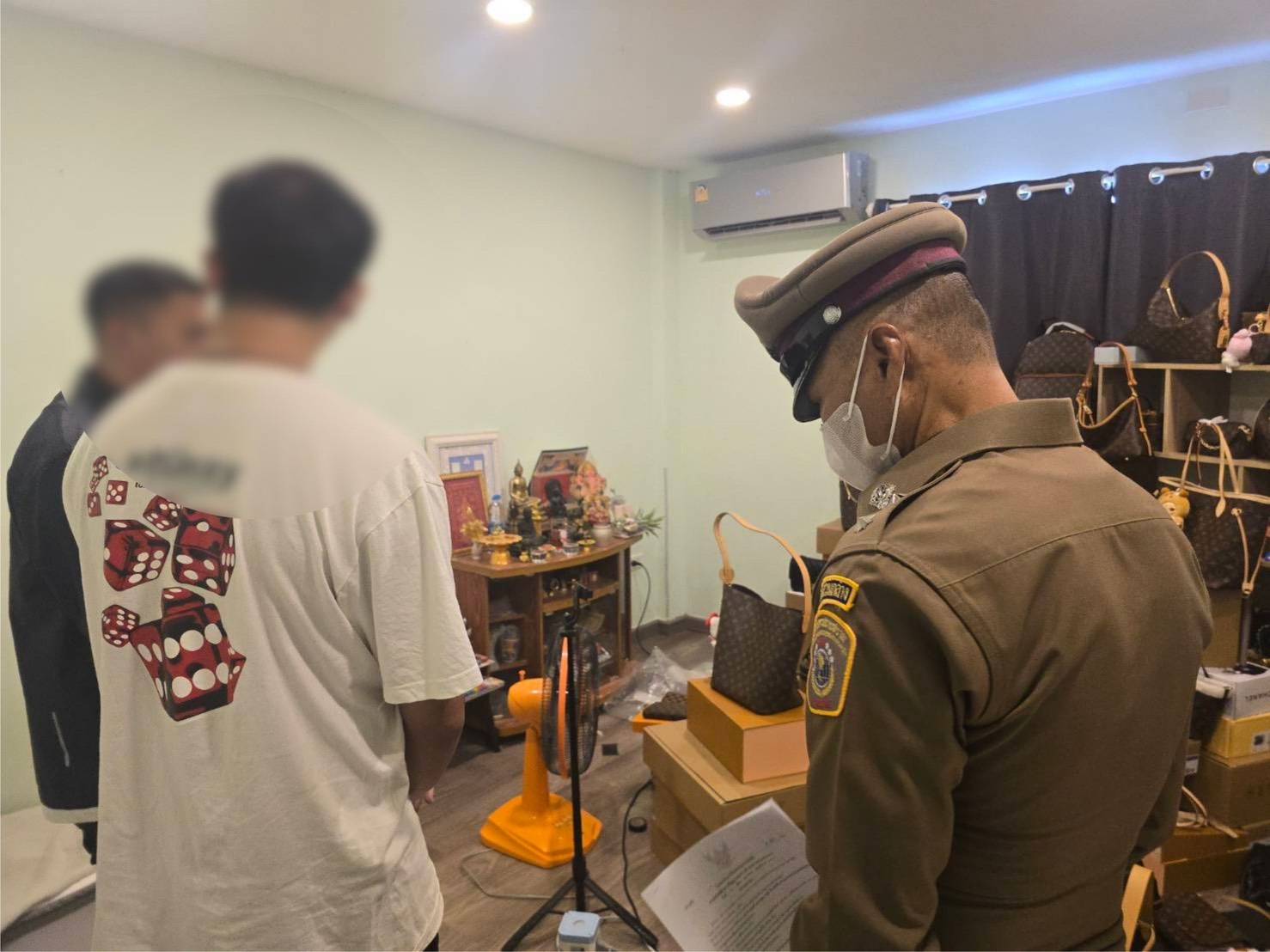 ร่วมจับกุมผู้ต้องหา 1 ราย นายกฤษฎา (สงวนนามสกุล) อายุ 38 ปี พร้อมตรวจยึดของกลาง กระเป๋า หมาวก เครื่องหนังแบรนด์เนม อาทิ ยี่ห้อ Louis Vuitton ,Chanel, ,Gucci,Dior จำนวนกว่า 100 ชิ้น