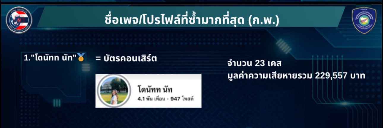 รอง ผบ.ตร./ผอ.ศปอส.ตร. และ พล.ต.ท.จิรภพ ภูริเดช ผู้ช่วย ผบ.ตร./รอง ผอ.ศปอส.ตร. เปิดสถิติคดีและความเสียหายเกี่ยวกับการหลอกลวงออนไลน์ ในรอบเดือนกุมภาพันธ์ จำนวน 28,180 เคส พบว่าอันดับ1 ที่มีการแจ้งความเข้ามามากที่สุด คือ การหลอกซื้อสินค้าและบริการ ซึ่งในรูปแบบการหลอกนี้ยังพบว่าจำนวนคดีมากที่สุด เป็นการหลอกซื้อสินค้าทั่วไปกว่า 3,753 เคส ขณะที่สินค้าแฟชั่น/แบรนด์เนม และอาหาร/เครื่องดื่ม รองลงมาตามลำดับ ซึ่งพบโปรไฟล์ปลอมที่ใช้ซ้ำมากที่สุดชื่อ “โดนัททท นัท” ขายบัตรคอนเสิร์ต จำนวน 23 เคส มูลค่าความเสียหายกว่า 2.2 แสนบาท