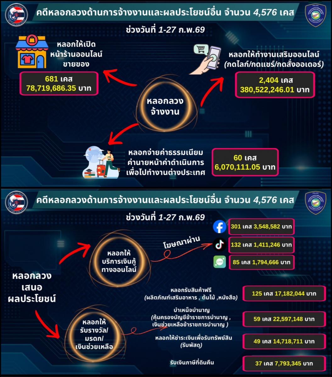 อันดับ 2 หลอกลวงจ้างงานและผลประโยชน์อื่น จำนวน 4,576 เคส โดยมีลักษณะการหลอกในส่วนของการจ้างงาน แบ่งเป็น 3 รูปแบบ ได้แก่