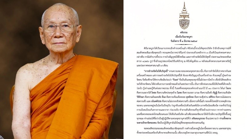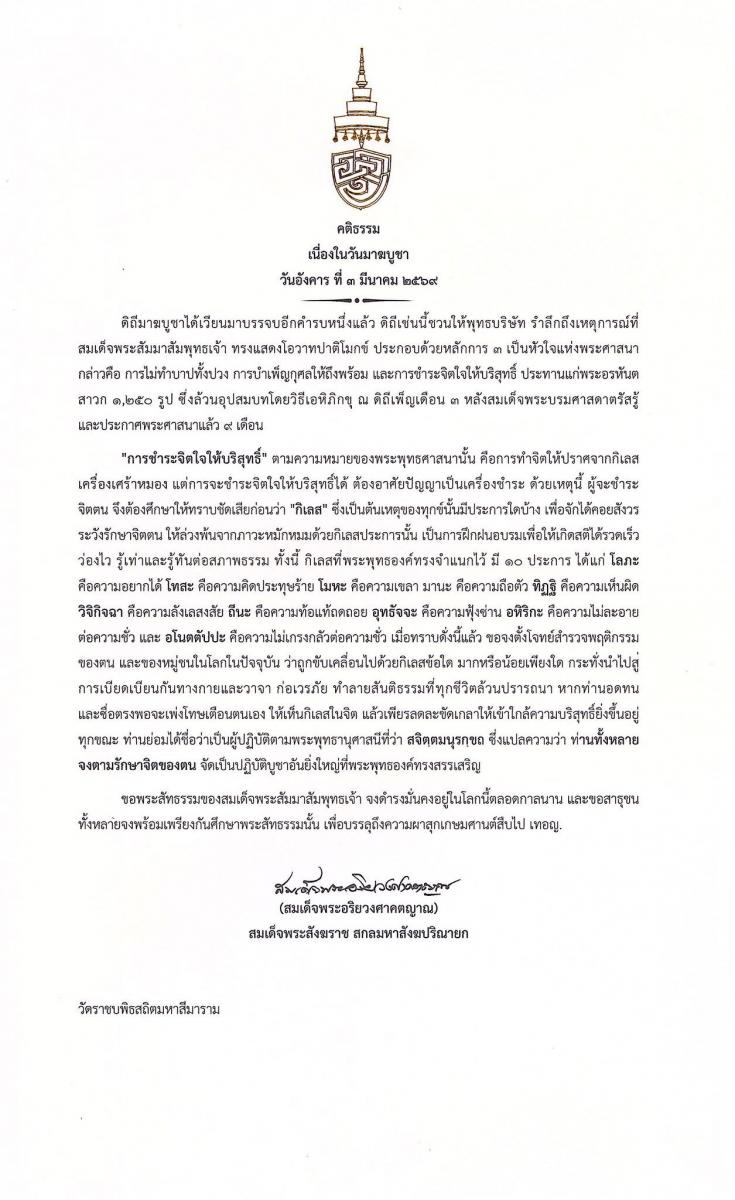 วันที่ 3 มี.ค.2569 สำนักงานเลขานุการสมเด็จพระสังฆราช เผยแพร่คติธรรม เนื่องในวันมาฆบูชา ๓ กุมภาพันธ์ ๒๕๖๙
