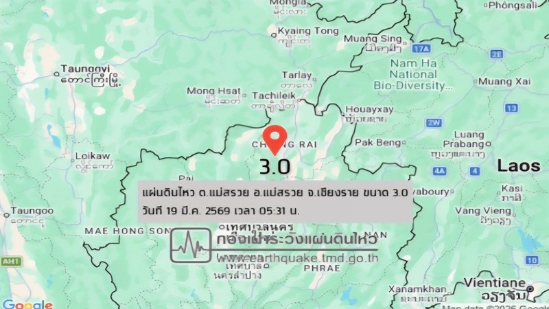 วันที่ 19 มี.ค. 2569 เวลา 05.31 น. ผู้สื่อข่าวรายงานว่า กองเฝ้าระวังแผ่นดินไหว กรมอุตุนิยมวิทยา แจ้งเหตุ แผ่นดินไหว ขนาด 3.0 ความลึก 2 กม. ภายในพื้นที่ของ ต.แม่สรวย อ.แม่สรวย จ.เชียงราย 19.71°N,99.62°E