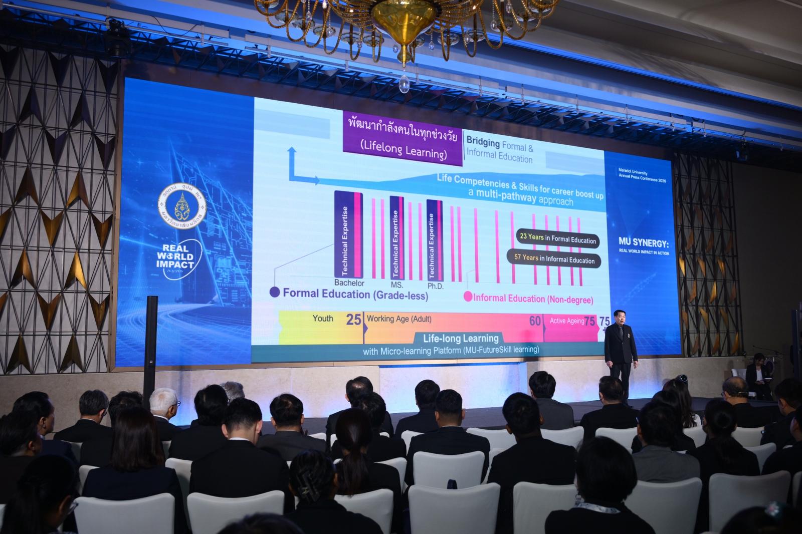 “การประกาศ MU SYNERGY: Real World Impact in Action ถือเป็นการยกระดับบทบาทของมหาวิทยาลัยมหิดลจากผู้ผลิตองค์ความรู้ สู่ผู้สร้างโครงสร้างพื้นฐานนวัตกรรมสังคมและเศรษฐกิจ ที่เชื่อมโยงมหาวิทยาลัย อุตสาหกรรม และเศรษฐกิจเข้าด้วยกันอย่างเป็นระบบ โดยมหาวิทยาลัยยังคงเดินหน้าตามยุทธศาสตร์ Real World Impact (ปี 2567-2571) โดยใช้ 3 กลไกหลัก ได้แก่ A1 – Synergistic and Collaborative Innovations (สานภารกิจวิจัย): มุ่งเน้นการบูรณาการงานวิจัยและนวัตกรรมร่วมกับภาคเอกชนและเครือข่ายระดับโลก เพื่อเปลี่ยนงานวิจัย "จากหิ้งสู่ห้าง" ให้เกิดมูลค่าทางเศรษฐกิจ A2 – Empowering Learners (เพิ่มอำนาจผู้เรียน): พัฒนาระบบการศึกษาแบบ Lifelong Learning และการเรียนรู้ผ่านการทำงานจริง (CWIE) เพื่อสร้างกำลังคนทักษะสูงที่พร้อมทำงานได้ทันที A3 – Amplifying Operations (ขยายผลสัมฤทธิ์): ยกระดับการดำเนินงานภายในให้มีประสิทธิภาพ คล่องตัว และยั่งยืน เพื่อสนับสนุนภารกิจของมหาวิทยาลัยในทุกมิติ ทั้งนี้เป้าหมายยุทธศาสตร์มุ่งเน้นที่การลงมือทำเพื่อสังคม สร้างความเปลี่ยนแปลงที่ยั่งยืน ขยายบทบาทจากสถาบันการศึกษาสู่ศูนย์กลางในการขับเคลื่อนสังคม สร้างผลกระทบที่จับต้องได้ร่วมขับเคลื่อนนโยบายสาธารณะ เพื่อยกระดับศักยภาพสู่การเป็นฟันเฟืองหลักในการขับเคลื่อนเศรษฐกิจ (Engine of Growth) ของประเทศ