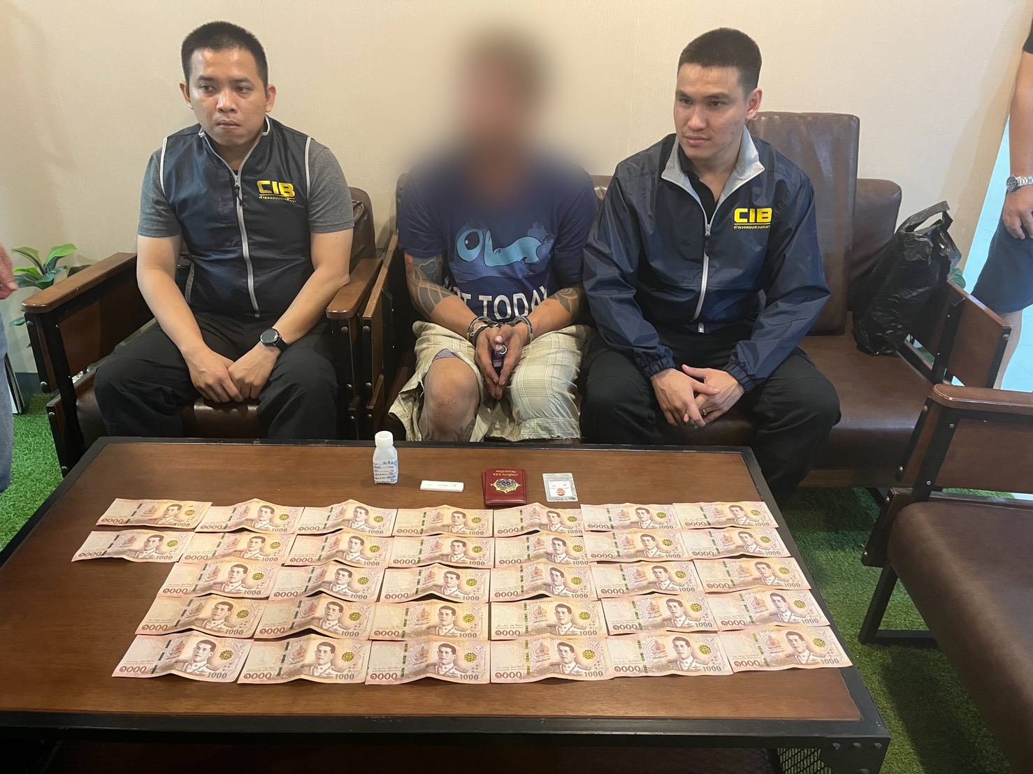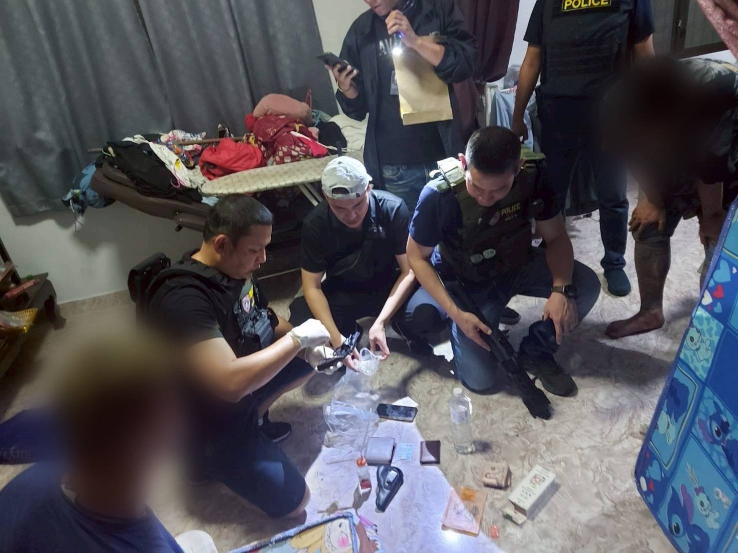เมื่อถึงเวลานัดหมายและมีการส่งมอบอาวุธปืนเรียบร้อยแล้ว เจ้าหน้าที่ที่วางกำลังอยู่โดยรอบจึงแสดงตัวเข้าจับกุมทันที จากการตรวจค้นภายในห้องพัก นอกจากจะพบอาวุธปืนและเงินสดที่ใช้ในการล่อซื้อแล้ว ยังตรวจพบยาไอซ์และยาบ้าพร้อมอุปกรณ์การเสพซุกซ่อนอยู่ภายในห้องอีกด้วย