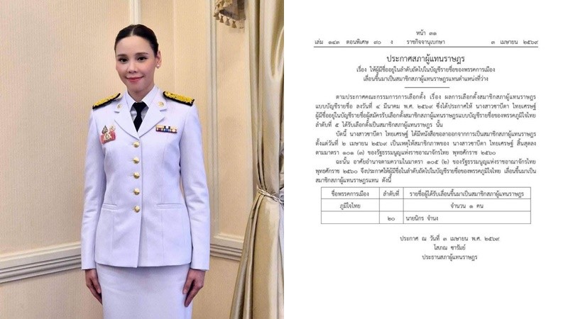 วันที่ 4 เม.ย.2569 ผู้สื่อข่าวรายงานว่า เว็บไซต์ราชกิจจานุเบกษา เผยแพร่ประกาศสภาผู้แทนราษฎร เรื่อง ให้ผู้มีชื่ออยู่ในลำดับถัดไปในบัญชีรายชื่อของพรรคการเมือง เลื่อนขึ้นมาเป็นสมาชิกสภาผู้แทนราษฎรแทนตำแหน่งที่ว่าง ตามประกาศคณะกรรมการการเลือกตั้ง เรื่อง ผลการเลือกตั้งสมาชิกสภาผู้แทนราษฎรแบบบัญชีรายชื่อ ลงวันที่ 4 มีนาคม พ.ศ. 2569