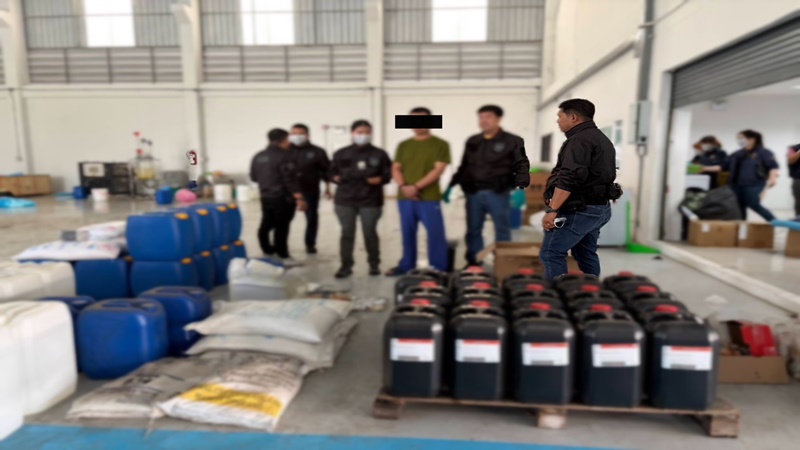 วันที่ 4 เม.ย. 2569 พ.ต.ต. สุริยา สิงหกมล เลขาธิการ ป.ป.ส. มอบหมายให้ นายคณิศร ภาพีรนนท์ ผู้อำนวยการสำนักปราบปรามยาเสพติด และเจ้าหน้าที่ สถาบันวิชาการและตรวจพิสูจน์ยาเสพติด สำนักงาน ป.ป.ส. เข้าตรวจค้นโรงงานเครือข่ายชาวจีนลักลอบผลิตเอโทมิเดต ในพื้นที่ อ.บางบ่อ จ.สมุทรปราการ ผลการปฏิบัติ จับกุมนายหวง (สงวนนามสกุล) ชาวจีน 1 คน พร้อมตรวจยึด เอโทมิเดตแบบน้ำ 42 ลิตร และแบบเกล็ด 1 กก. สารเคมีตั้งต้นผลิตเอโทมิเดต 140 ขวด,เอทานอล (Ethanol), กรดไฮโดรคลอริค (Hydrochloric acid), โทลูอีนซัลโฟนิคแอซิด (p-Toluenesulfonic acid), กลีเซอรีน (Glycerin) และสารเคมีชนิดอื่น รวมประมาณ 11.9 ตัน