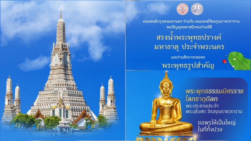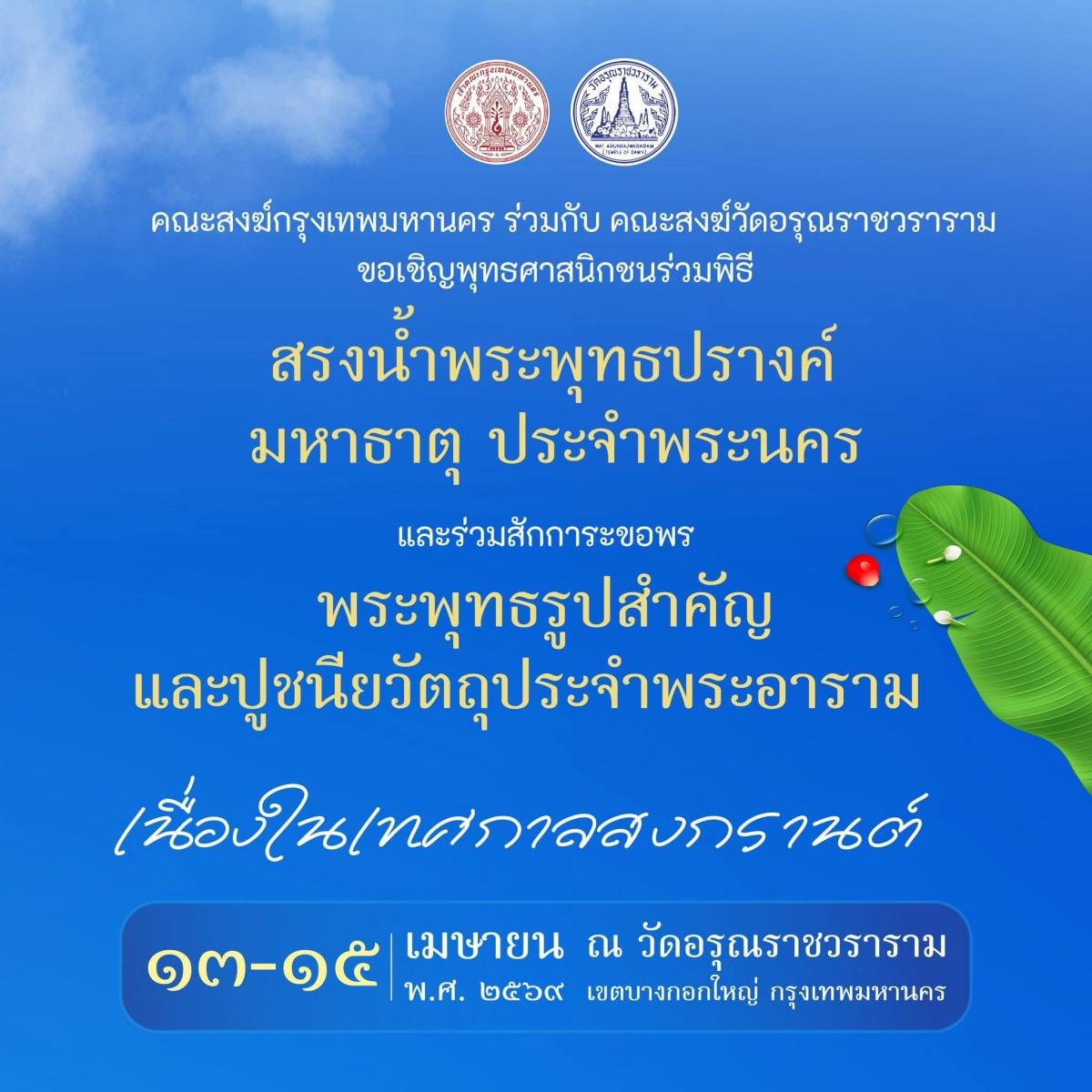คณะสงฆ์กรุงเทพมหานคร ร่วมกับ คณะสงฆ์วัดอรุณราชวราราม ขอเชิญชวนพุทธศาสนิกชนและประชาชนทั่วไป ร่วมสืบสานคุณค่าทางวัฒนธรรมและเสริมสิริมงคลเนื่องในเทศกาลสงกรานต์ ประจำปีพุทธศักราช ๒๕๖๙
