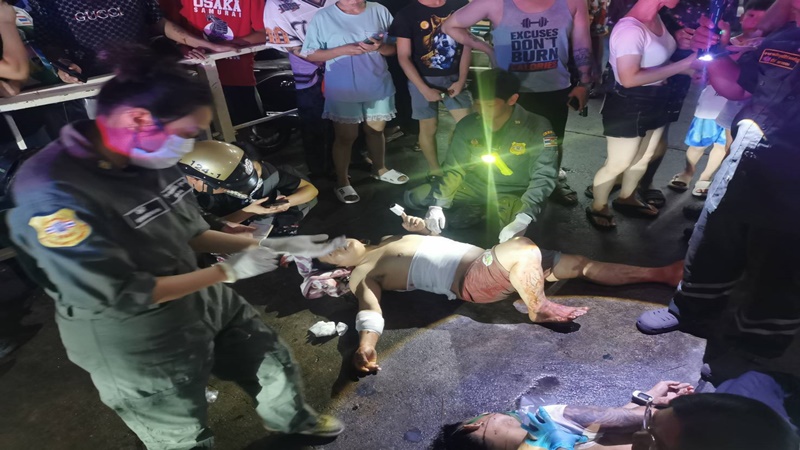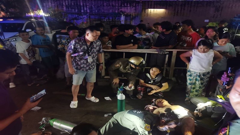 ที่เกิดเหตุพบผู้บาดเจ็บนอนรอความช่วยเหลืออยู่หลายราย เจ้าหน้าที่กู้ภัยต้องเร่งปฐมพยาบาลและกระจายตัวนำส่งโรงพยาบาลอย่างเร่งด่วน โดยคู่กรณีแบ่งออกเป็น 2 กลุ่ม คือกลุ่มฝั่งคนไทย บาดเจ็บ 3 ราย และกลุ่มฝั่งแรงงานเมียนมา บาดเจ็บ 4 ราย