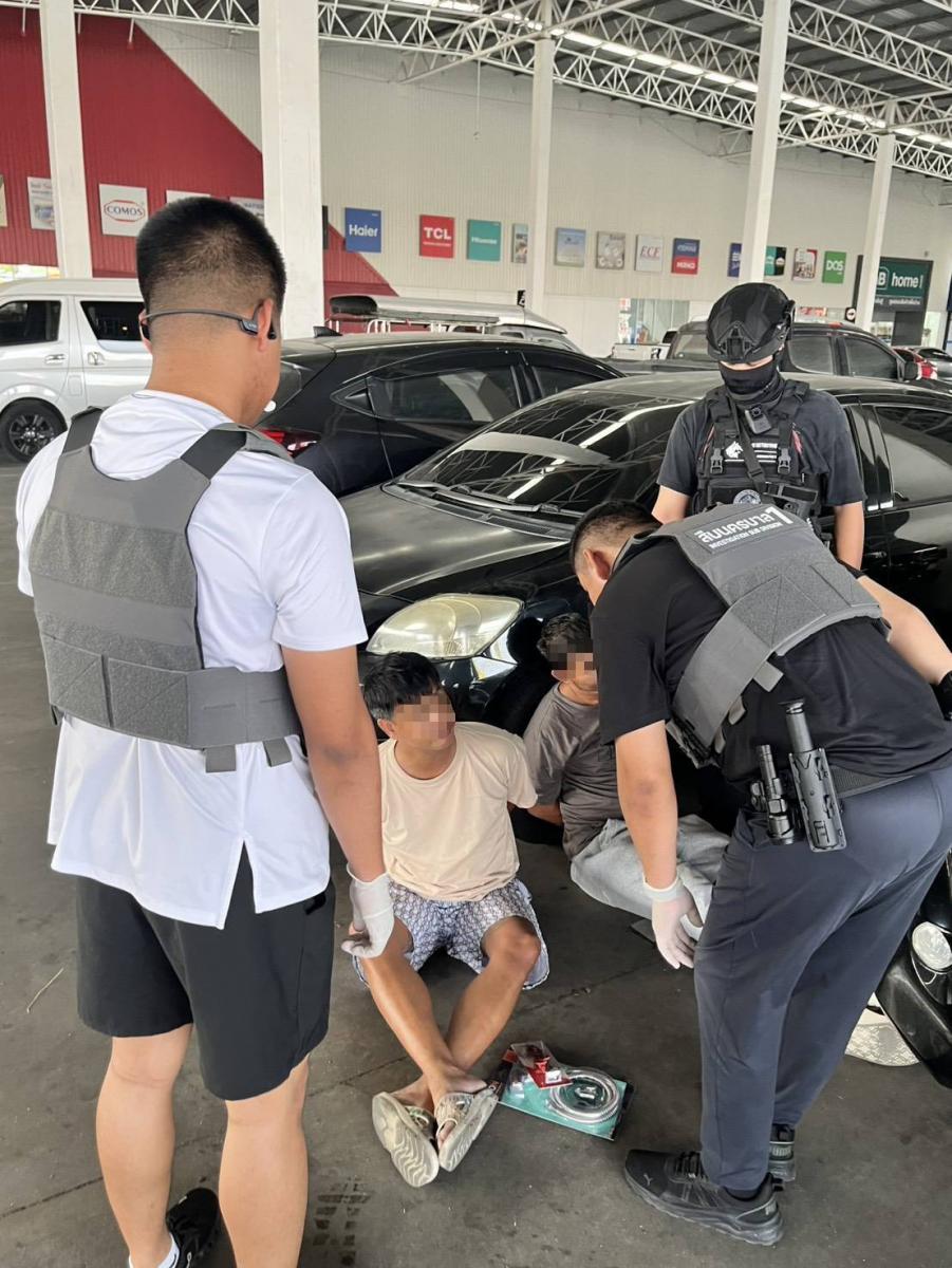 กระทั่งวันที่ 23 เมษายน 2569 เวลา 17.20 น. เจ้าหน้าที่เข้าจับกุมผู้ต้องหา 2 ราย บริเวณลานจอดรถ ไทวัสดุ สาขาบางบัวทอง ได้แก่
