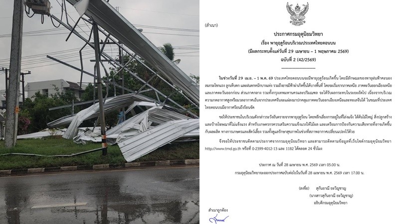วันที่ 28 เมษายน 2569 น.กรมอุตุนิยมวิทยา ประกาศเรื่อง พายุฤดูร้อนบริเวณประเทศไทยตอนบน (มีผลกระทบตั้งแต่วันที่ 29 เมษายน - 1 พฤษภาคม 2569) ฉบับที่ 2 (42/2569) ดังนี้